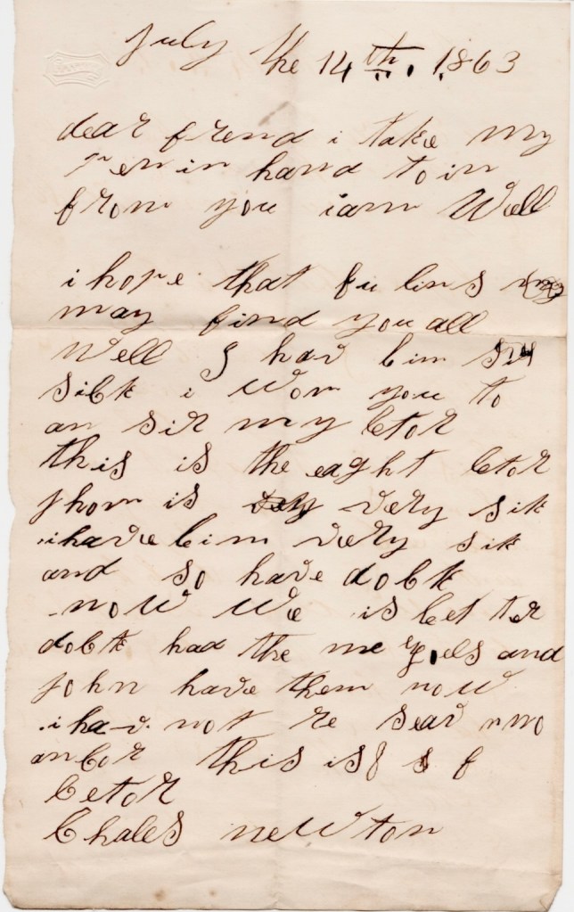 John is very sick. I have been very sick [too] and so has Dock now. We is better. Dock had the measles and John has them now. I have not received no answer. This is 8th letter. — Charles Newton