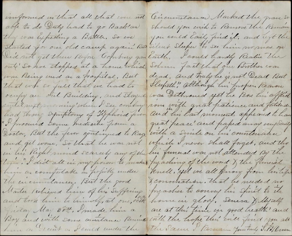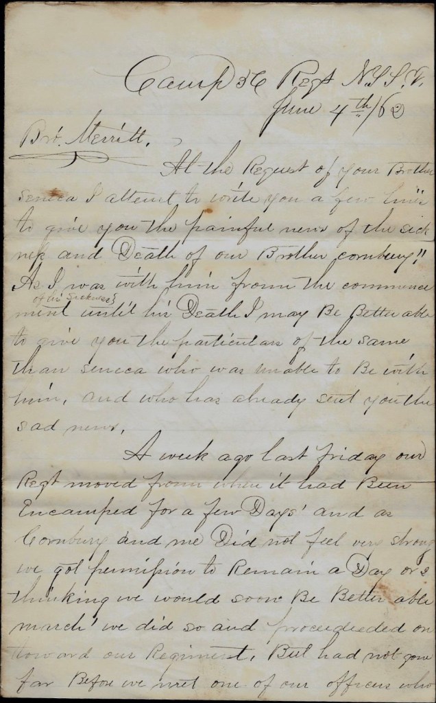 Like so many other letters written home by soldiers in the Civil War, Springstead conveys the sad details of a comrade’s death to the deceased loved ones at home. In this case, Springstead describes the final days of Cornbury Merritt (1839-1862) who died of typhoid fever on 30 May 1862 near Bottom’s Bridge, Virginia. Cornbury’s younger brother, Seneca Merritt, was also in the same company but asked Springstead to write the “particulars” of Cornbury’s death since he was with him the entire time of his sickness. Most of these types of letters are eerily similar in content and expressions. It was customary to comfort the grieving family with news that their loved one died peacefully and with the hope of eternal salvation.