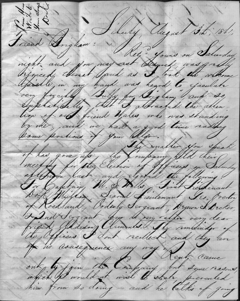 Reub[en Wales] came out to join the company but some masons which I wouldn’t wish to state prevented him from so doing and he talks of going West to spend the remainder of the summer and fall. I told him to hold on and if you came home, we would get up a company on our own hooks, & take the officers and make a big thing of it. I would advise you to come home anyhow. If you like a soldier’s life, you can easily get a better and more comfortable situation that you have and if not, you have lots of friends who would like to see the “bould soger boy” once more.