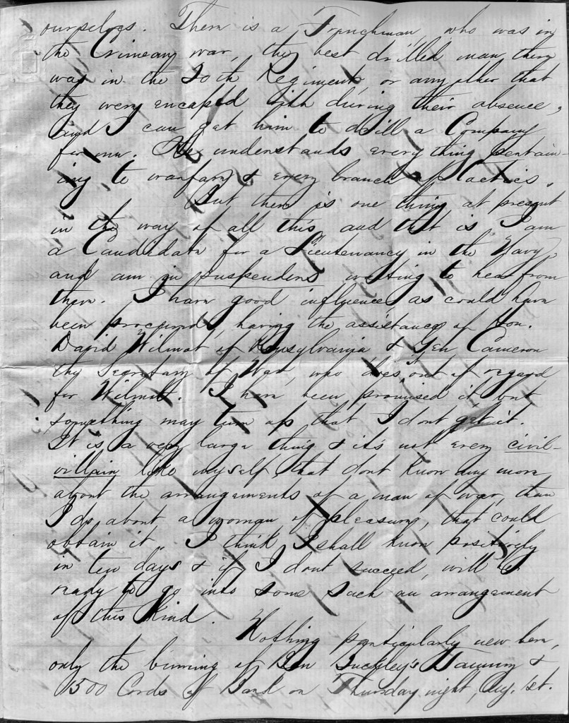 But there is one thing at present in the way of all this and that is I am a candidate for a Lieutenancy in the Navy and am in suspenders waiting to hear form them I have good influence as could have been procured, having the assistance of Hon. David Wilmot of Pennsylvania & Gen. [Simon] Cameron, the Secretary of War, who does out of regard for Wilmot. I have been promised it but something may turn up that I don’t get it. It is a very large thing & it’s not every civil villain like myself that don’t know any more about the arrangements of a man of war than I do about a woman of pleasure, that could obtain it. I think I shall know positively in ten days & if I don’t succeed, will be reay to go into some such arrangement of this kind.