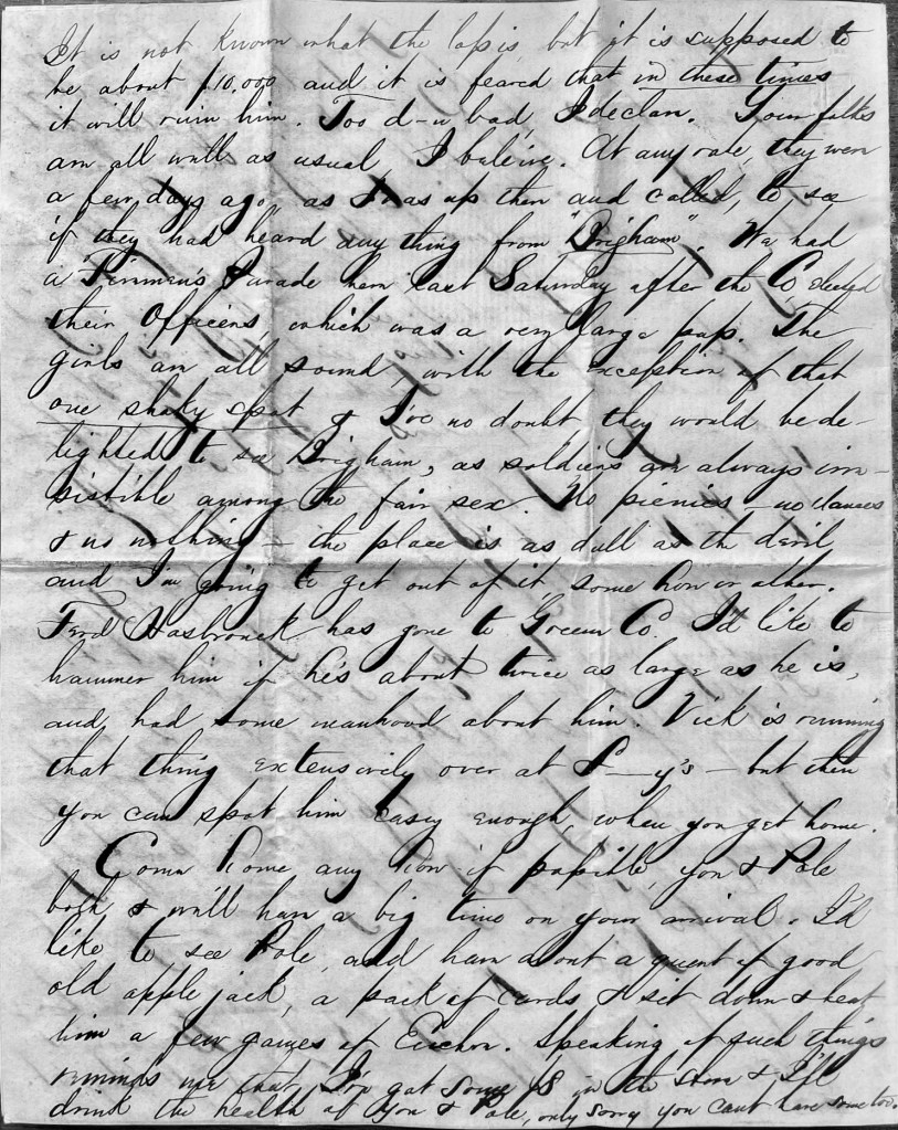 Ferd Hasbrouck has gone to Green county. I’d like to hammer him if he’s about as twice as large as he is, and had some manhood about him. Vick is running that thing extensively over at L—-y’s, but then you can spot him easy enough when you get home. Come home anyhow if possible—you and Pole both—and we’ll have a big time on your arrival. I’d like to see Pole and have about a quart of good old applejack, a pack of cards, & sit down and beat him a few games of Euchre. Speaking of such things reminds me that I’ve got some $ in the store & I’ll drink the health of you & Pole, only sorry you can’t have some too. Come home. Write to yours always, — Dock