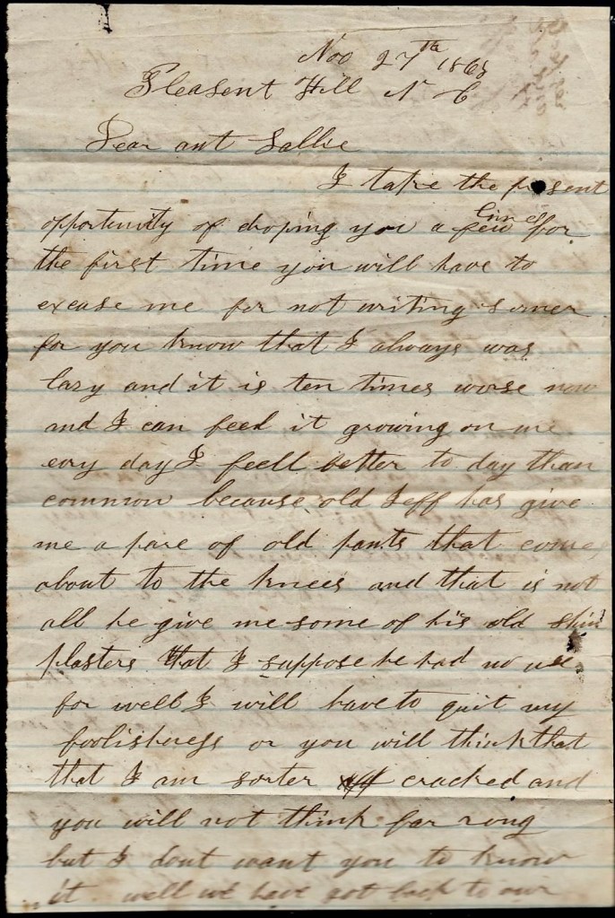 I take the present opportunity of dropping you a few lines for the first time. You will have to excuse me for not writing sooner for you know that I always was lazy and it is ten times worse now and I can feel it growing on me every day. I feel better today than common because Old Jeff has give me a pair of old pants that come about to the knees and that is not all. He give me some of his old shin plasters that I suppose he had no use for. Well, I will have to quit my foolishness or you will think that I am sorter cracked and you will not think far wrong. But I don’t want you to know it.