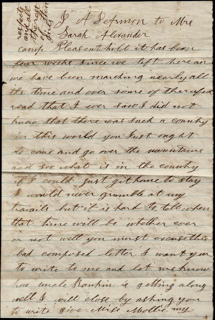 Well we have got back to our camp at Pleasant Hill. It has been four weeks since we left here and we have been marching nearly all the time and over some of the roughest roads that I ever saw. I did not know that was such a country in this world. You just ought to come and go over the mountains and see what is in the country. If I could just get home to stay, I would never grumble at my travails. But it is hard to tell when that time will be, whether ever or not.