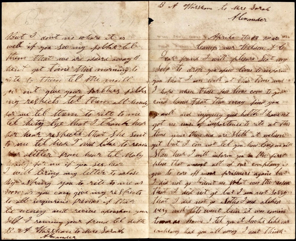 They had a big fight here the day before we got here and there was several of our company was wounded. Alfred Washan and B[ranch] A. Washam and Lee Brown was wounded. 1 Tom Cashion and S. R. Andrews weren’t in the fight—they have got the measles. Smiley is in Goldsboro and Tom is in Petersburg.