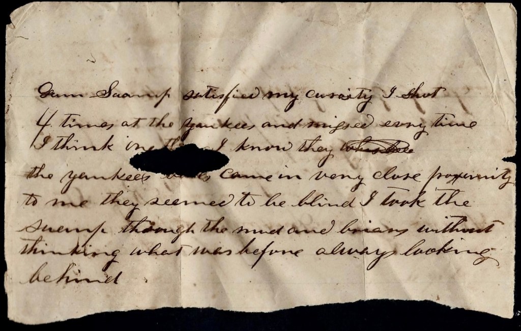 Gum Swamp satisfied my curiosity. I shot 4 times at the Yankees and missed every time I think. One thing I know, they—the Yankees—came in very close proximity to me. They seemed to be blind. I took the swamp through the mud and briars without thinking what was before, always looking behind.
