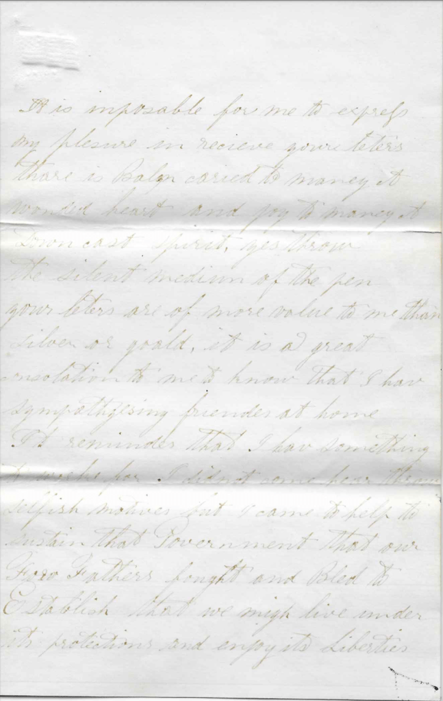 It is impossible for me to express my pleasure in receiving your letter—they are balm carried to many a wounded heart and joy to many a downcast spirit. Yes, through the silent medium of the pen, your letters are of more value to me than silver or gold. It is a great consolation to me to know that I have sympathizing friends at home. It reminds [me] that I have something to work for. I didn’t come here through selfish motives but i came to help to sustain that government that our fore fathers fought and bled to establish that we might live under the protections and enjoy its liberties.