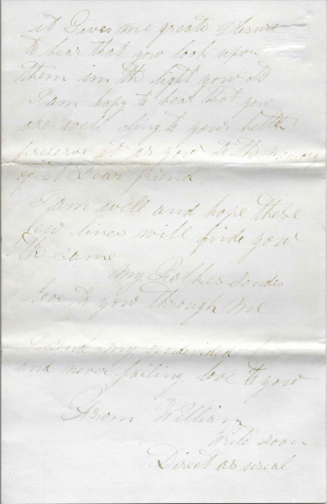 I received letters from two of my sisters since I write to you. My mother is as well as usual. I don’t know how long we will stay in this place. I think it will not be long. You need—or I hope you will not—let your mind be so uneasy. Let fond hope cheer your lonely hours. Let us both look forward to the time when we shall meet again and when we [will] be blessed with peace in our land.