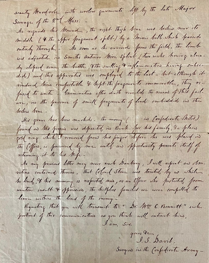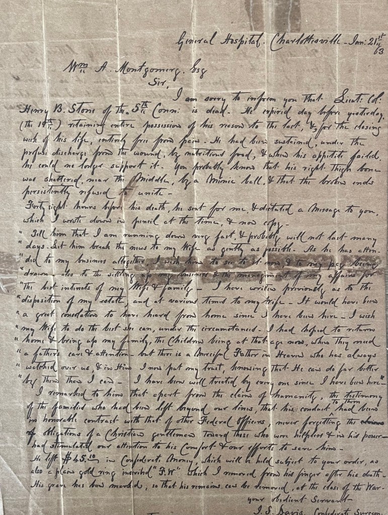 Dear sir, your letter of the 4th inst., inquiring the condition of Lieut. Col. Stone, has just reached me. I am sorry to inform you that he died here on the 20th of January. Immediately after, I wrote at some length to Mr. Montgomery of Danburg, communicating such facts as I thought might interest the friends of the deceased & conveying certain messages which he entrusted to me when he saw that his death was approaching. Feeling more than usual anxiety that the letter should reach its destination, & having learned by experience that the “Flag of Truce” is uncertain, I gave it to a Maryland lady whose husband had been very kind to the Colonel, and who, having been long separated from her child in Baltimore, was about to attempt her return. She promised to mail it as soon as she passed the Federal lines, & but for her detention it would long since have been received. I am hopeful that it may arrive soon.