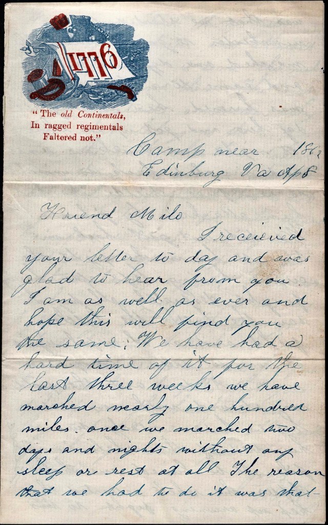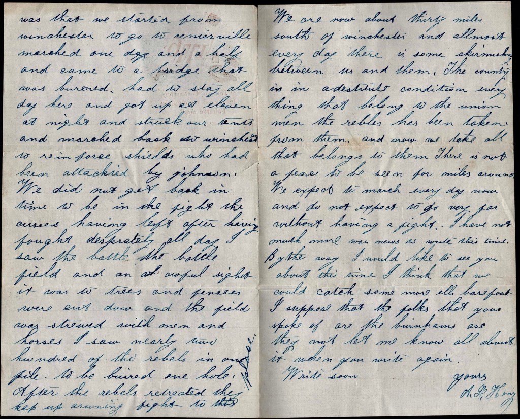 We have had a hard time of it for the last three weeks. We have marched nearly one hundred miles. Once we marched two days and nights without any sleep or rest at all. The reason that we had to do it was that we started from Winchester to go to Centerville, marched one day and a half, and came to a bridge that was burned. Had to stay all day here and got up at eleven at night and struck our tents and marched back to Winchester to reinforce Shields who had been attacked by Johnson [Jackson]. We did not get back in time to be in the fight, the cusses having left after having fought desperately all day. I saw the battlefield and an awful sight it was too. Trees and fences were cut down and the field was strewed with men and horses. I saw nearly two hundred of the rebels in one pile to be buried in one hole. After the rebels retreated, they kept up a running fight to this place.