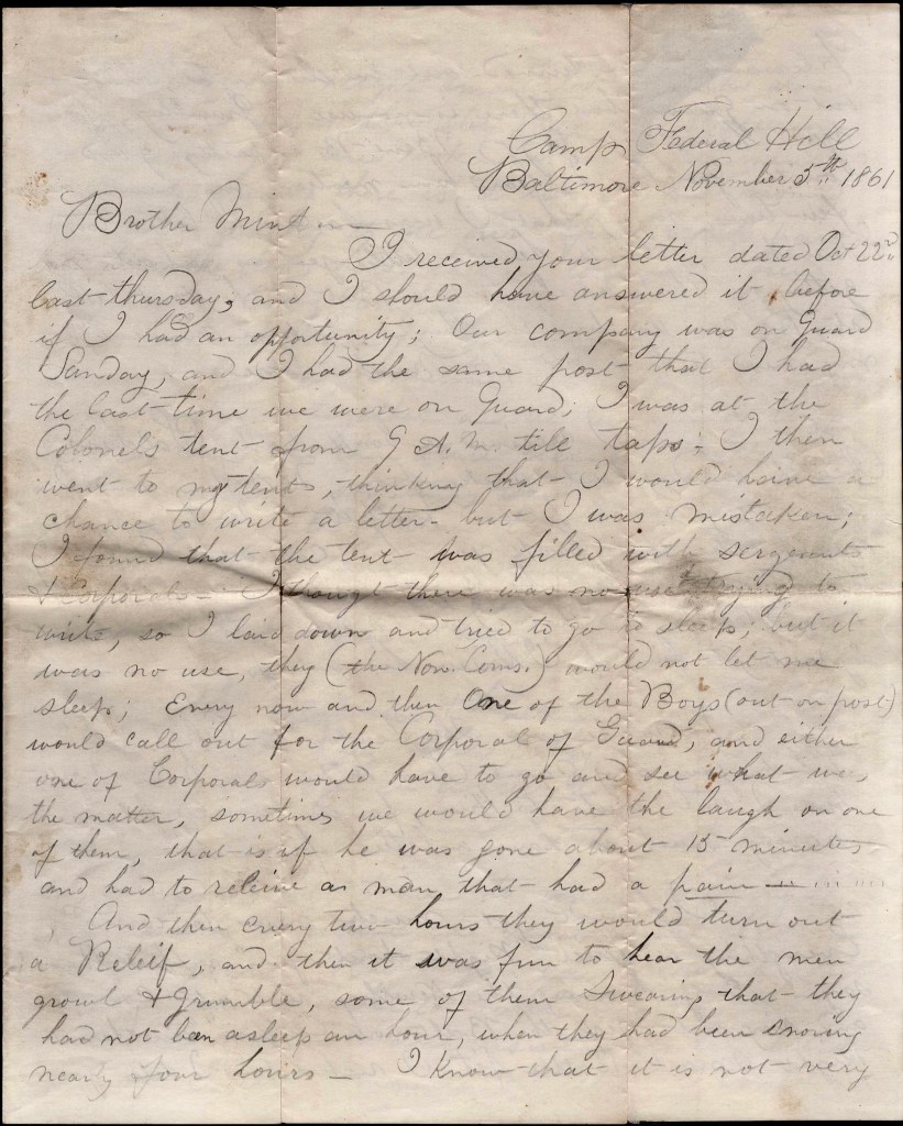 I received your letter dated October 22nd last Thursday and I should have answered it before if I had an opportunity. Our company was on guard Sunday and I had the same post that I had the last time we were on guard. I was at the Colonel’s tent from 9 a.m. till taps. I then went to my tent thinking that I would have a chance to write a letter but I was mistaken. I found the tent was filled with sergeants and corporals. I thought there was no use trying to write so I laid down and tried to go to sleep but it was no use—they (the non-coms) would not let me sleep. Every now and then one of the Boys (out on post) would call out for the Corporal of the Guard and either one of the corporals would have to go and see what was the matter. Sometimes we would have the laugh on one of them—that is, if he was gone about 15 minutes and had to relieve a man that had a pain [ ]. And then every two hours they would turn out a relief and then it was fun to hear the men growl and grumble, some of them swearing that they had not been asleep an hour when they had been snoring nearly four hours. I know that it is not very pleasant to be turned out in the night and go out on guard, but there is no use of grumbling for you have got to go.