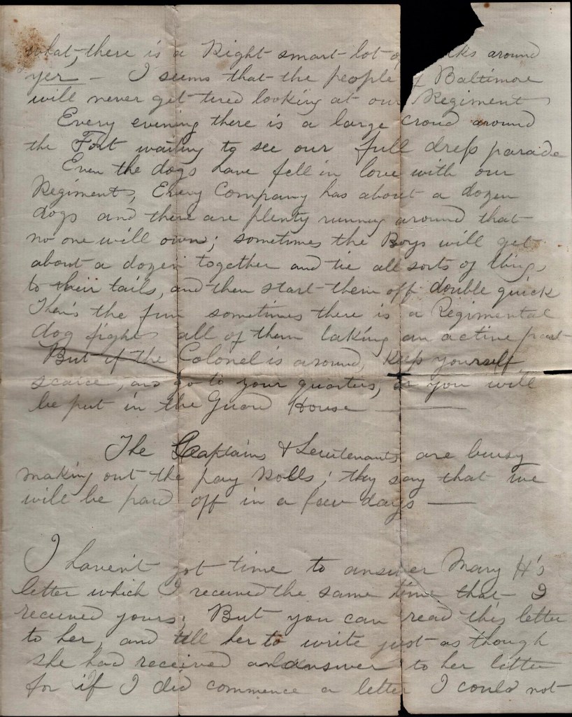 It seems that the people of Baltimore will never get tired looking at our regiment. Every evening there is a large crowd around the fort waiting to see our full dress parade. Even the dogs have fell in love with our regiment. Every company has about a dozen dogs and there are plenty running around that no one will own. Sometimes the Boys will get about a dozen together and tie all sorts of things to their tails and then start them off double quick. Then’s the fun. Sometimes there is a regimental dog fight, all of them taking an active part. But if the Colonel’s around, keep yourself scarce and go to your quarters as you will be put in the guard house. 1