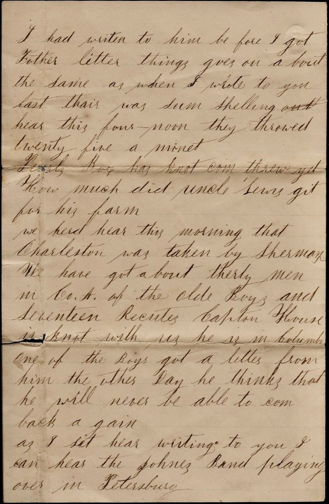As I sit here writing to you, I can hear the Johnnies’ band playing over in Petersburg.