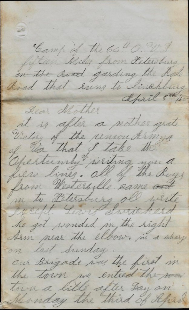 It is after another great victory of the Union Army of Virginia that I take the opportunity of writing you a few lines. All of the boys from Westerville came in to Petersburg all right except Lewis Swickard. He got wounded in the right arm near the elbow in a charge on last Sunday. 1