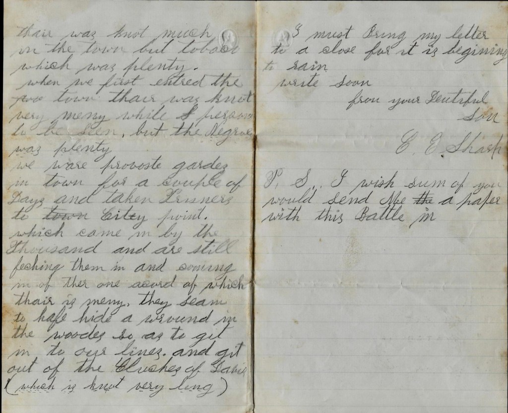 We were provost guards in town for a couple of days and taken prisoners to City Point which came in by the thousands are still fetching them in and coming in of their own accord of which there is many. They seem to have hid around in the woods so as to get into our lines and get out of the clutches of Davis (which is not very long).