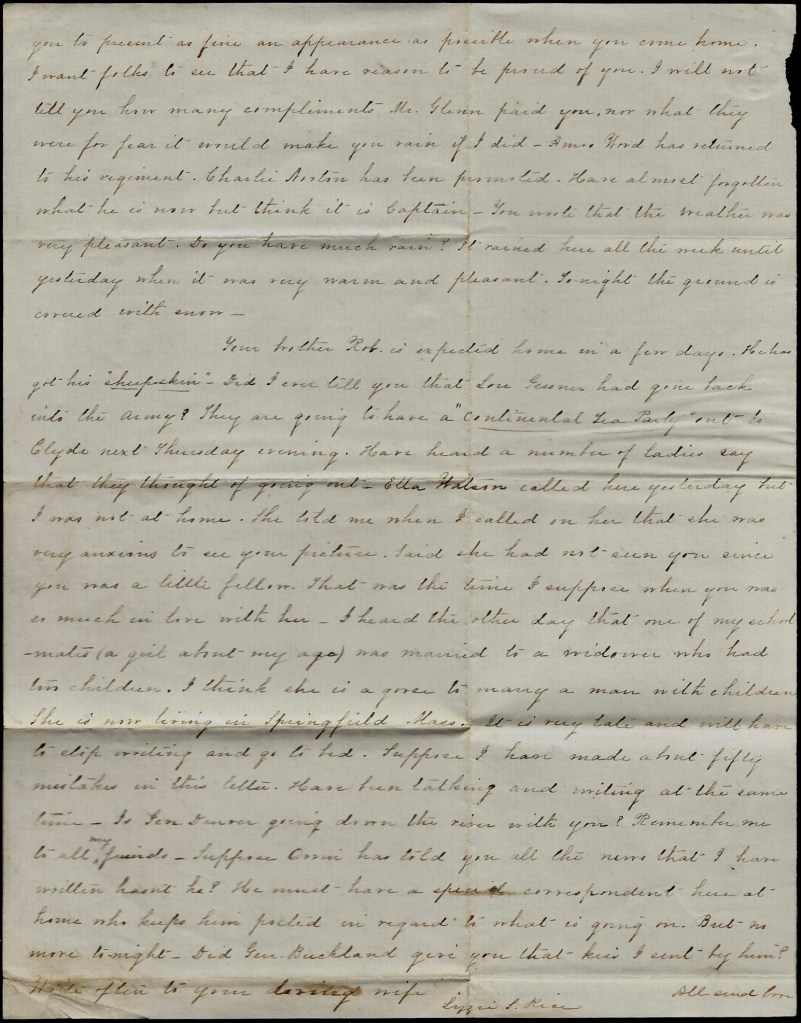 There is a regiment of soldiers stationed here now which makes the realities of war come closer home than ever. The camp is called Camp Chrogan (72nd [Ohio] Regiment). I went over last week with one of the officers, Captain [Samuel A. J.] Snyder 1 (he is handsome as he can be I tell you). What didn’t I have a good time. It looks so funny to see them was dishes and cook and their tents are so funny. But enough of this.