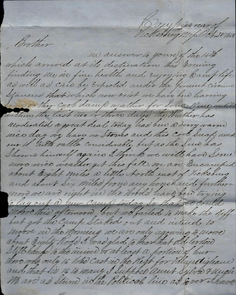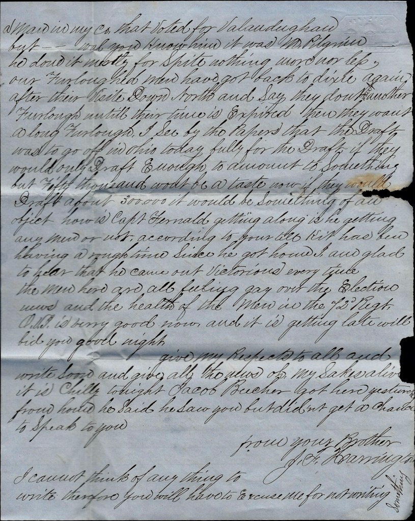 Unfortunately this partial and unsigned letter provides us with few clues to the author’s identity. I’m inclined to believe it was a young female between the age of 15 and 20 who lived in Fremont, Sandusky county, Ohio. She writes of receiving a Christmas gift of “a very nice tooth brush and a cake of tooth soap and a comb”—a practical and coveted luxury at the time. She also writes of visiting the camp of the 72nd Ohio Regiment at nearby Camp Chrogan in company with the handsome Capt. Samuel A. J. Snyder. “What didn’t I have a good time!” she wrote her friend Mary.