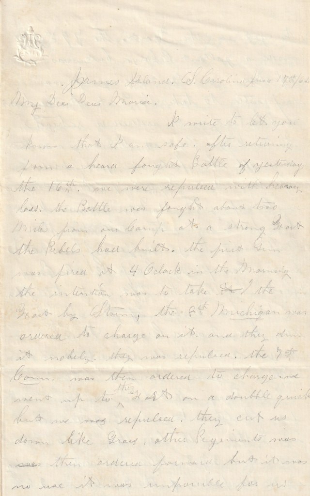 I write to let you know that I am safe after returning from a hard fought battle of yesterday the 16th. We were repulsed with heavy loss. The battle was fought about two miles from our camp at a strong fort 1 the Rebels had built. The first gun was fired at 4 o’clock in the morning. The intention was to take the fort by storming. The 8th Michigan was ordered to charge on it and they done it nobly [but] they was repulsed. 2 The 7th Connecticut was then ordered to charge and went up to the fort on a double quick but we was repulsed. They cut us down like grass. Other regiments was then ordered forward but it was no use. It was impossible for us to get in the fort.
