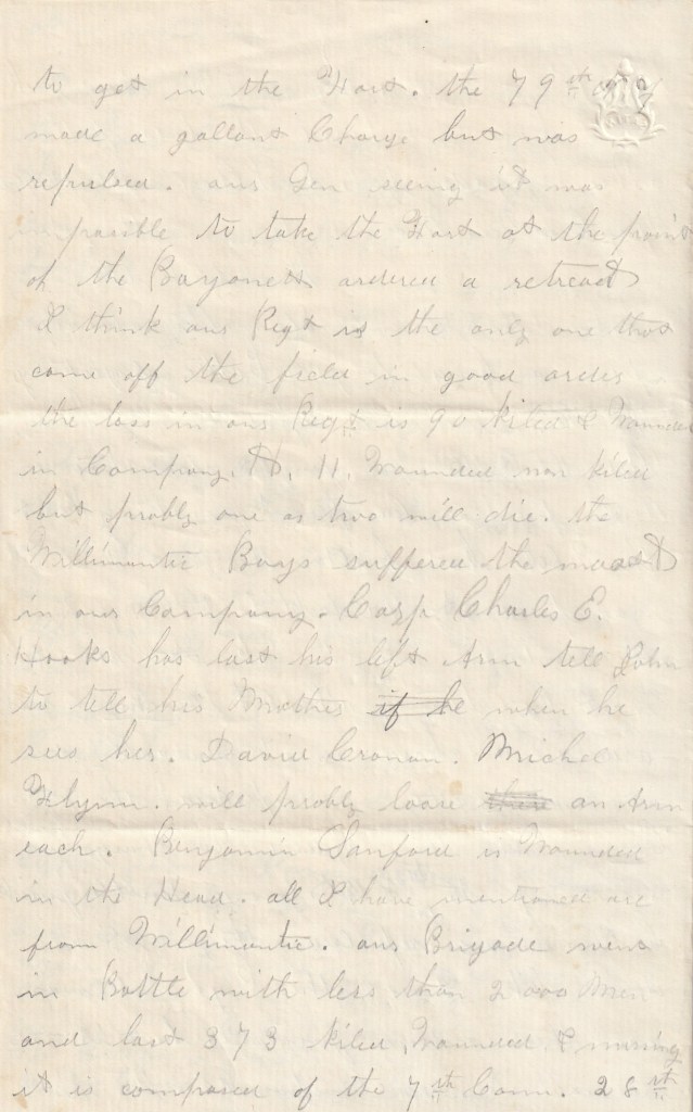 The 79th New York made a gallant charge but was repulsed. Our general, seeing it was impossible to take the fort at the point of the bayonet, ordered at retreat. I think our regiment is the only one that came off the field in good order. The loss in our regiment is 90 killed & wounded, in Company H, 11 wounded, none killed, but probably one or two will die. The Willimantic Boys suffered the most in our company. Corp. Charles E. Hooks has lost his left arm. Tell John to tell his Mother when he sees her. David Cronan, Michael Flynn will probably lose an arm each. Benjamin Sanford is wounded in the head. All I have mentioned are from Willimantic. Our Brigade went in battle with less than 2,000 men and lost 373 killed, wounded, and missing. It is composed of the 7th Conn., 28th Mass., 8th Michigan, 79th New York. I have not heard the loss of the other Brigades yet but they will probably equal our own. 3 The [1st] Connecticut Battery [under Capt. Alfred P. Rockwell] done very good service. We helped them to work their guns.