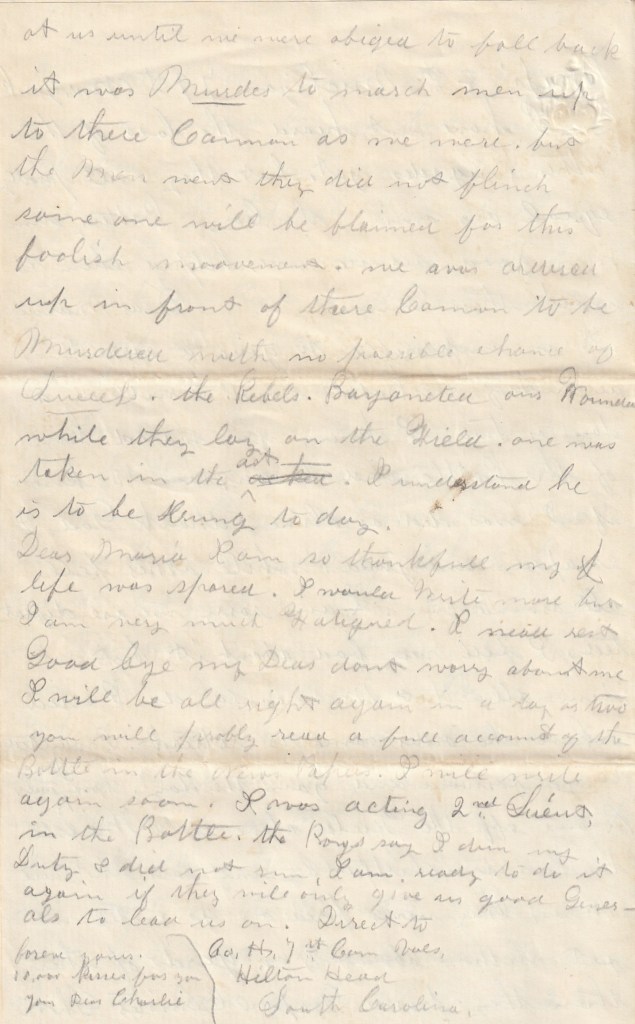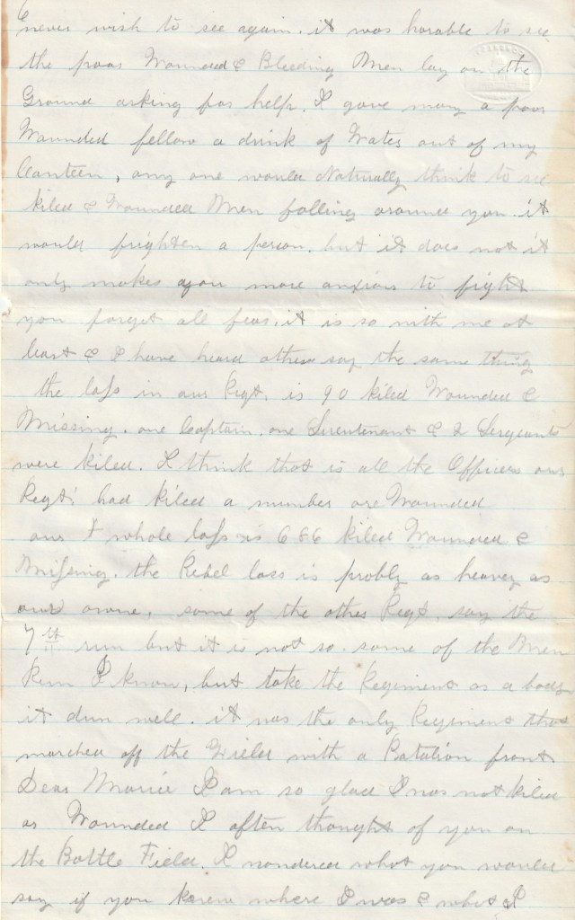 Dear Maria, it is impossible to give a correct account of the battle now. I will in a day or two. I knew you would hear of the battle and be anxious to know if I was dead or alive. Thank God I escaped uninjured while others fell all around me. I am sorry we are defeated. I feel very bad about it but we done all the men could do. I cried when the order came to retreat. I wanted to go forward and gain the day. How I ever came off the field alive in a miracle. The bullets whistled by my ears like hail stones. They never fired on us until we got within about 300 yards of them. Then they poured grape & canister shot at us until we were obliged to fall back. 4 It was murder to march men up to these cannons as we were but the men went. They did not flinch.