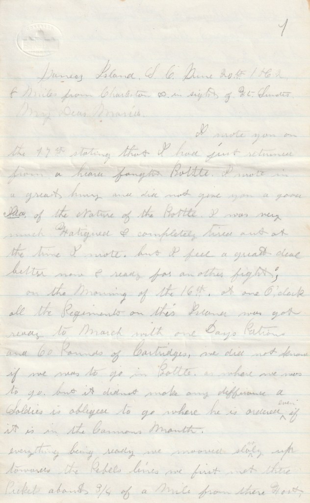James Island, South Carolina June 20th 1862 8 miles from Charleston & in sight of Fort Sumter
