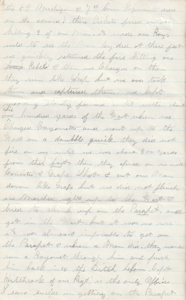 We kept moving slowly forward until within about six hundred yards of the fort when we charged bayonets and went up to the fort on a double quick. They did not fire on us until we was about 300 yards from the fort. Then they opened on us with canister & grapeshot & cut our men down like grass. But we did not flinch. We marched right up to the fort & tried to climb up on the parapet and get in the fort but it was no use. It was almost impossible to get on the parapet. And when a man did, they would run a bayonet through him and push him back into the ditch below.