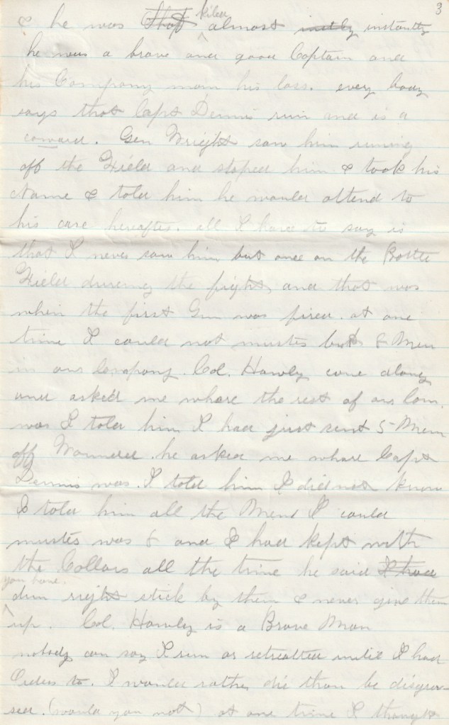 At one time I could not muster but 8 men in our company. Col. [Joseph Roswell] Hawley come along and asked me where the rest of our company was. I told him I had just sent 5 men off wounded. He asked me where Capt. Dennis was. I told him I did not know. I told him all the men I could muster was 8 and I had kept with the colors all the time. He said you have done right, stick by them and never give them up. Col. Hawley is a brave man. Nobody can say I run or retreated until I had orders to. I would rather die than be disgraced (would you not).