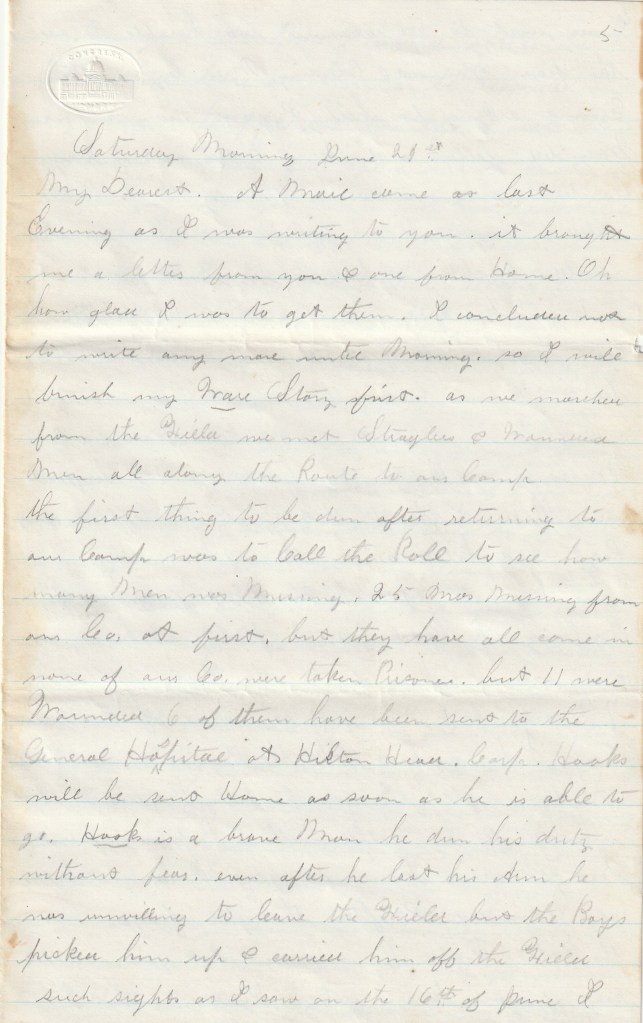 Saturday morning, June 21st. My dearest, a mail came in last evening as I was writing to you. It brought me a letter from you & one from home. Oh how glad I was to get them. I concluded not to write any more until morning so I will finish my war story first.