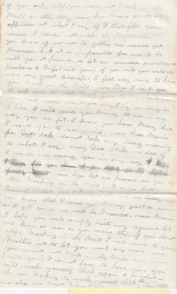 If you only will, you need not work in the mill another day. Now dear Maria, do not feel offended at what I say. If I thought you would, I would not make the proposition. you know if we were together we would get married but it is impossible for me to be with you at present so let us consider ourselves as husband and wife (will you?). If you will, you will do me a very great kindness. I feel very sorry to have you work in the mill…I will send you money to use in any way you see fit. I know you have money but I want you to use mine. Now dear Maria, for God’s sake, do not take any wrong meaning to what I say. May God strike me dead if I would ever wrong you in any way…