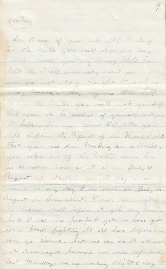 Dear Maria, if you will stop working in the mill, you will oblige me very much indeed. You say Mary Abell has left the mill now. Why don’t you? You are not strong enough to work so many hours as they require their help to work in the mill. You will make yourself sick again. Do be careful of yourself, won’t you? I hope when you receive this letter you will inform the agent of the Thread Mill that you are done working in a mill.