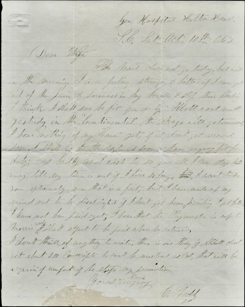 Monday, April 4th. Well, Mary, I think that I will just write you a few lines at this time. I have but very little to add that will be news to you. The government transport, Maple Leaf, was sunk Saturday morning by a torpedo in the river about twelve miles from here on her way to Pilatka. She was loaded with camp & garrison equipage for the troops at that place; also the officer’s private baggage. There was two women on board and a child—the wife of one of the officers and child and a number of officers, none of whom were lost that I can hear of which was very fortunate as the boat sunk at once. 1