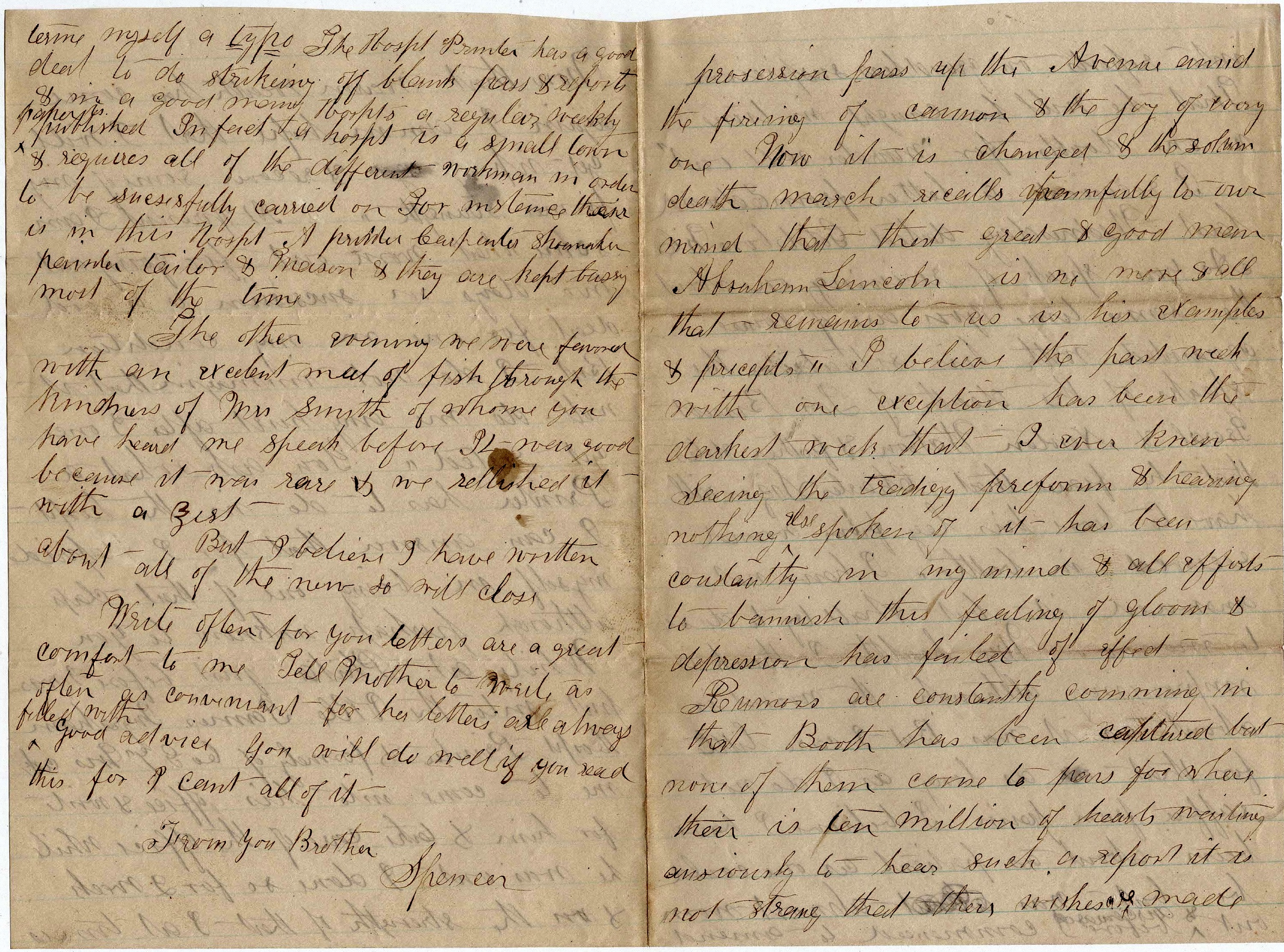 Write often for your letters are a great comfort to me. Tell Mother to write as often as convenient for her letters are always filled with good advice. You will do well if you read this for I can’t all of it. From your brother, — Spencer