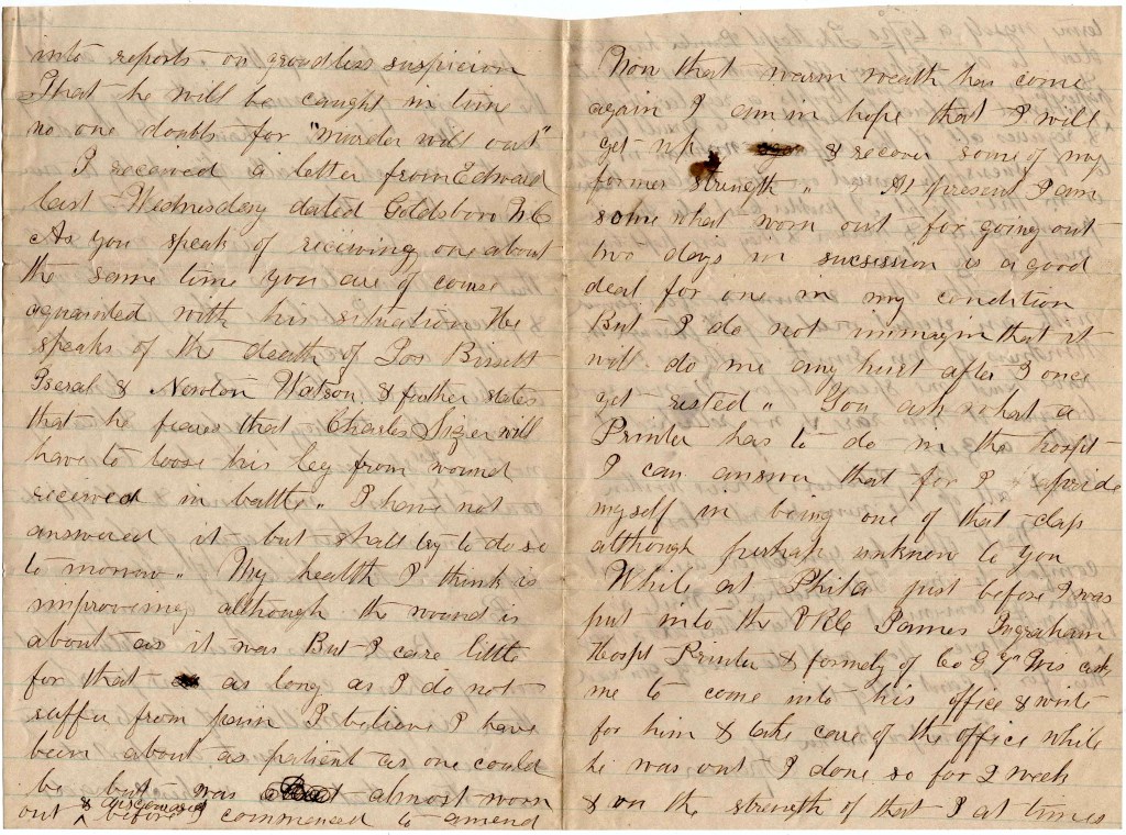 I received a letter from Edward last Wednesday dated Goldsboro, North Carolina. As you speak of receiving one about the same time you re of course acquainted with his situation. He speaks of the death of Joseph Bissett, Israel & Newton Watson & father states that he fears that Charles Sizer will have to lose his leg from a wound in battle. I have not answered it but shall try to do so tomorrow. My health I think is improving although the wound is about as it was. But I care little for that as long as I do not suffer from pain. I believe I have been about as patient as one could be but was almost worn out & discouraged before I commenced to mend. Now that warm weather has come again, I am in hopes that I will get up & recover some of my former strength. At present I am somewhat worn out for going out two days in succession is a good deal for one in my condition. But I do not imagine that it will do me any hurt after I once get rested.