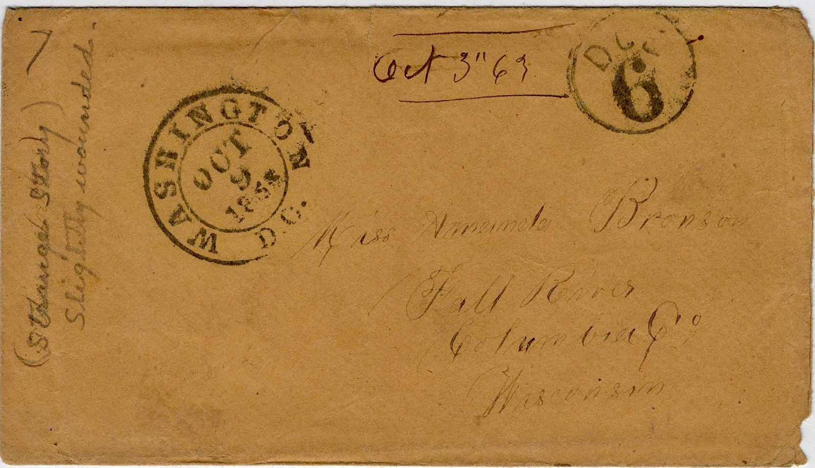 The following letters were written by Spencer H. Bronson (1842-1930), the son of Rev. Major Tyler Bronson (1802-1880) and Matilda Hotchkiss (1812-1872) of Fountain Prairie, Columbia county, Wisconsin. Spencer enlisted in Co. B, 7th Wisconsin Infantry in May 1861 with his older brothers, Elisha (“Eli”) Bronson (1834-1862) and Manly Tyler Bronson (1839-1863). Eli was killed on 17 September 1862 at Antietam, Maryland. Manly died at Belle Plains, Virginia, on 26 March 1863. Spencer survived the war—his memory forever preserved in witnessing the assassination of President Lincoln [see the Journal Sentinel]. He did not pass through the war unscathed, however. He was wounded on 28 August 1862 in the Battle of Gainsville, Va., again at the Battle of Fitzhugh Crossing, Va. on 29 April 1863, and once again on Day 1 at Gettysburg where he because a prisoner of war and confined at Libby Prison and Belle Island in Richmond. He was exchanged in August 1863 but lost his teeth due to scurvy. After he returned to his regiment, he was wounded again in the Battle of the Wilderness and sent to a hospital in Washington D. C. where he was transferred into the Veteran Reserve Corps. The doctor reports included in his pension file make gruesome reading. Aside from losing the two brothers previously mentioned, Spencer lost another brother, 1st Lt. Edward Hotchkiss Bronson of Co. K, 32nd Wisconsin Infantry.