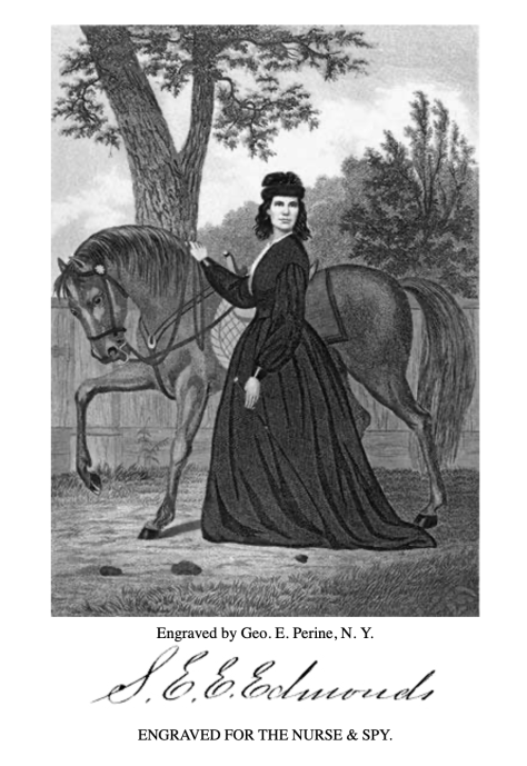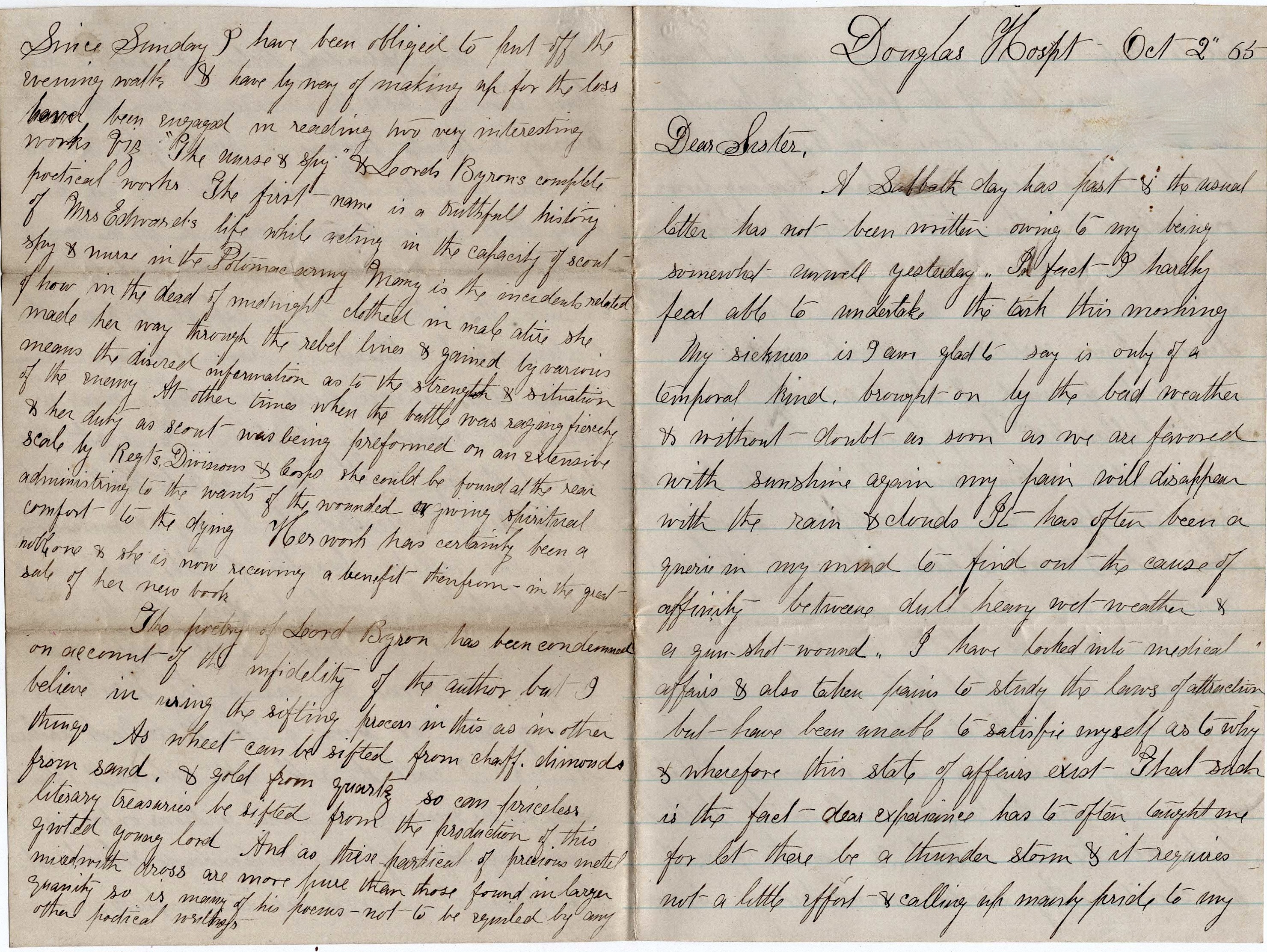 Since Sunday, I have been obliged to put off the evening walk & have by way of making up for the loss been engaged in reading two very interesting works—viz: “The Nurse & Spy” and Lord Byron’s Poetical Works. The first name is a truthful history of Mrs. Edwards’ life while acting in the capacity of scout, spy and nurse in the Potomac Army. Many is the incidents related of how in the dead of midnight, clothed in male attire, she made her way through the rebel lines & gained by various means the desired information as to the strength & situation of the enemy. At other times when the battle was raging fiercely & her duty as scout was being performed on an extensive scale by regiments, divisions, and corps, she could be found at the rear administering to the wants of the wounded or giving spiritual comfort to the dying. Her work has certainly been a noble one and she is now receiving a benefit therefrom in the great sale of her new book.