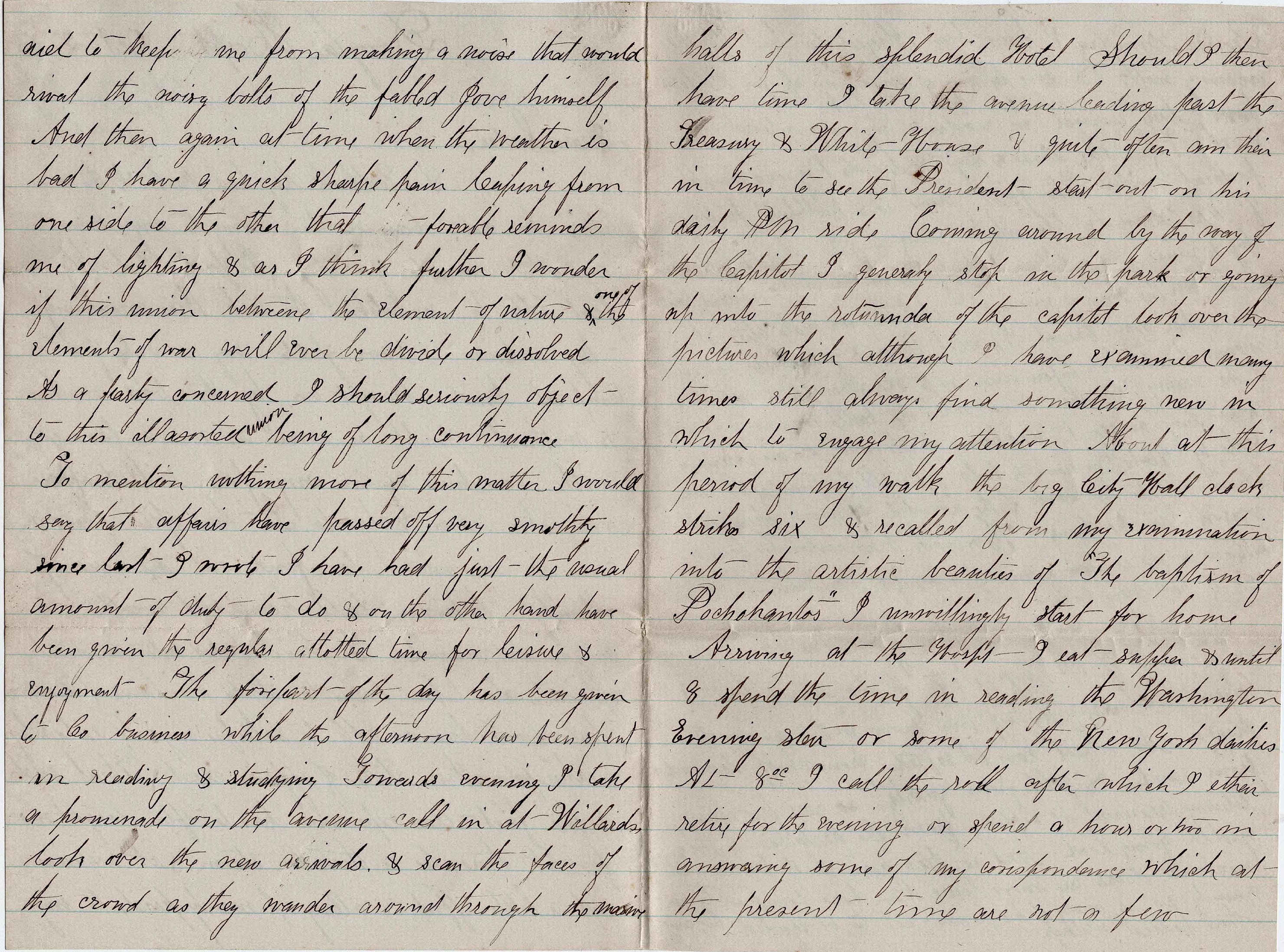 To mention nothing more of this matter, I would say that affairs have passed off very smoothly since last I wrote. I have had just the usual amount of duty to do & on the other hand, have been given to company business while the afternoon has been spent in reading & studying. Towards evening, I take a promenade on the avenue, call in at Willards, look over the new arrivals, and scan the faces of the crowd as they wander around through the massive halls of this splendid hotel. Should I then have time, I take the avenue leading past the Treasury [Department] and White House and quite often am there in time to see the President start out on his daily p.m. ride.