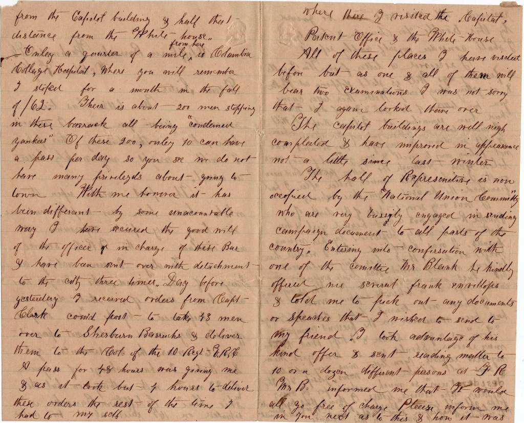 Cliffburne Barracks is situated on 16th Street, about two miles from the Capitol building & half that distance from the White House. Only a quarter of a mile from here is Columbia Collage Hospital where you will remember I stopped for a month in the fall of 62. There is about 200 men stopping in these barracks, all being “condemned yankees.” Of these 200, only 10 can have a pass per day so you see we do not have many privileges about going to town. With me, however, it has been different. By some unaccountable way, I have secured the good will of the officer in charge of these barracks & have been sent over with detachments to the city three times. Day before yesterday I received orders from Capt. Clark, commandant of post, to take 43 men over to Sherburn Barracks & deliver them to the Col. of the 10th Regt. V. R. C. A pass for 48 hours was given me & as it took but 4 hours to deliver these orders, the rest of the time I had to myself. I visited the Capitol, Patent Office, & the White House. All of these places I have visited before but as one & all of them will bear two examinations, I was not sorry that I again looked them over.