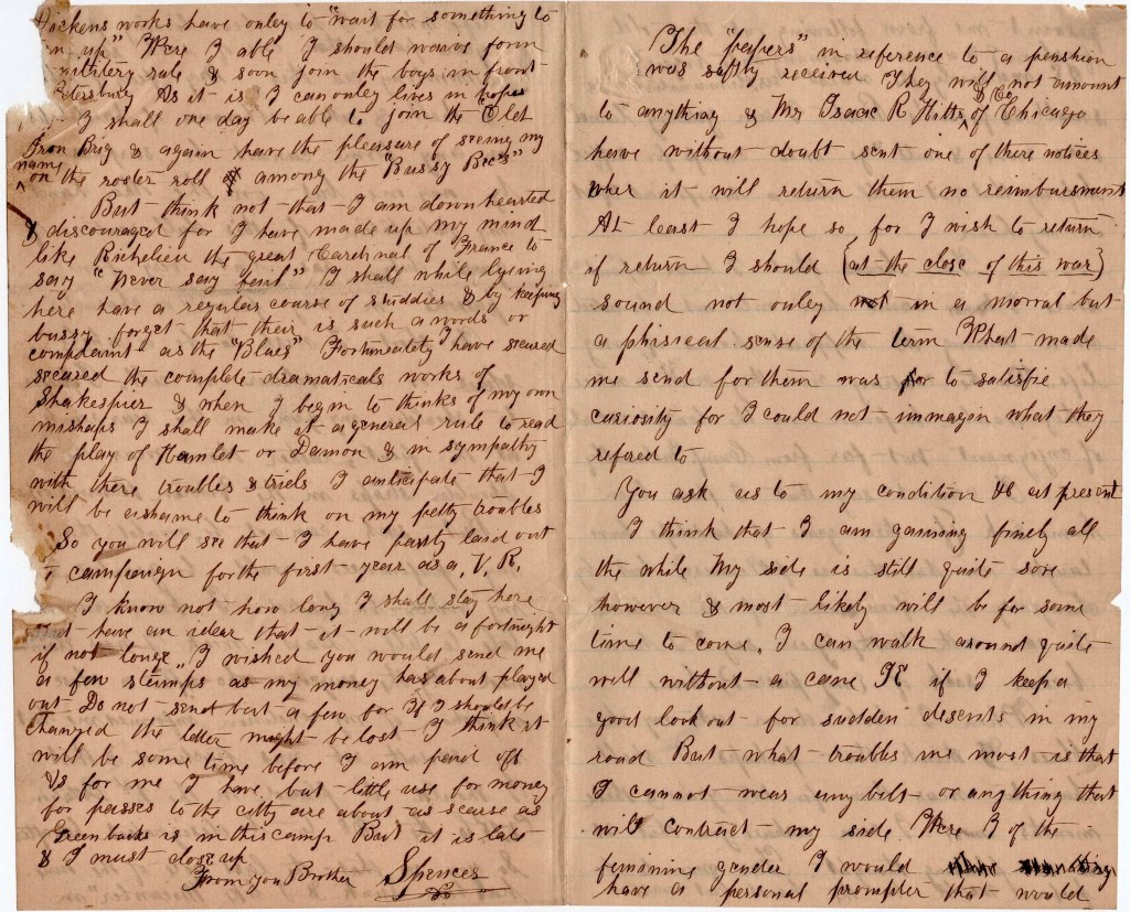 The “papers” in reference to a pension was safely received. They will not amount to anything & Mr. Isaac R. Hitts & Co. of Chicago have without doubt sent one of their notices where it will return them no reimbursement. At least I hope so for I wish to return. I should (at the close of the war) [return] sound—not only in a moral but physical sense of the term. What made me send for them was to satisfy curiosity for I could not imagine what they referred to.