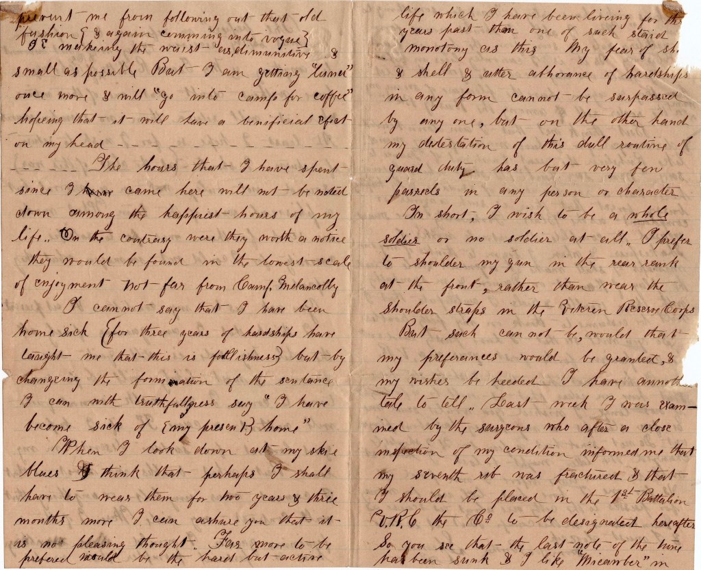 In short, I wish to be a whole soldier or no soldier at all. I prefer to shoulder my gun in the rear rank at the front, rather than wear the shoulder straps in the Veteran Reserve Corps. But such cannot be. Would that my preferences would be granted, & my wishes be heeded.