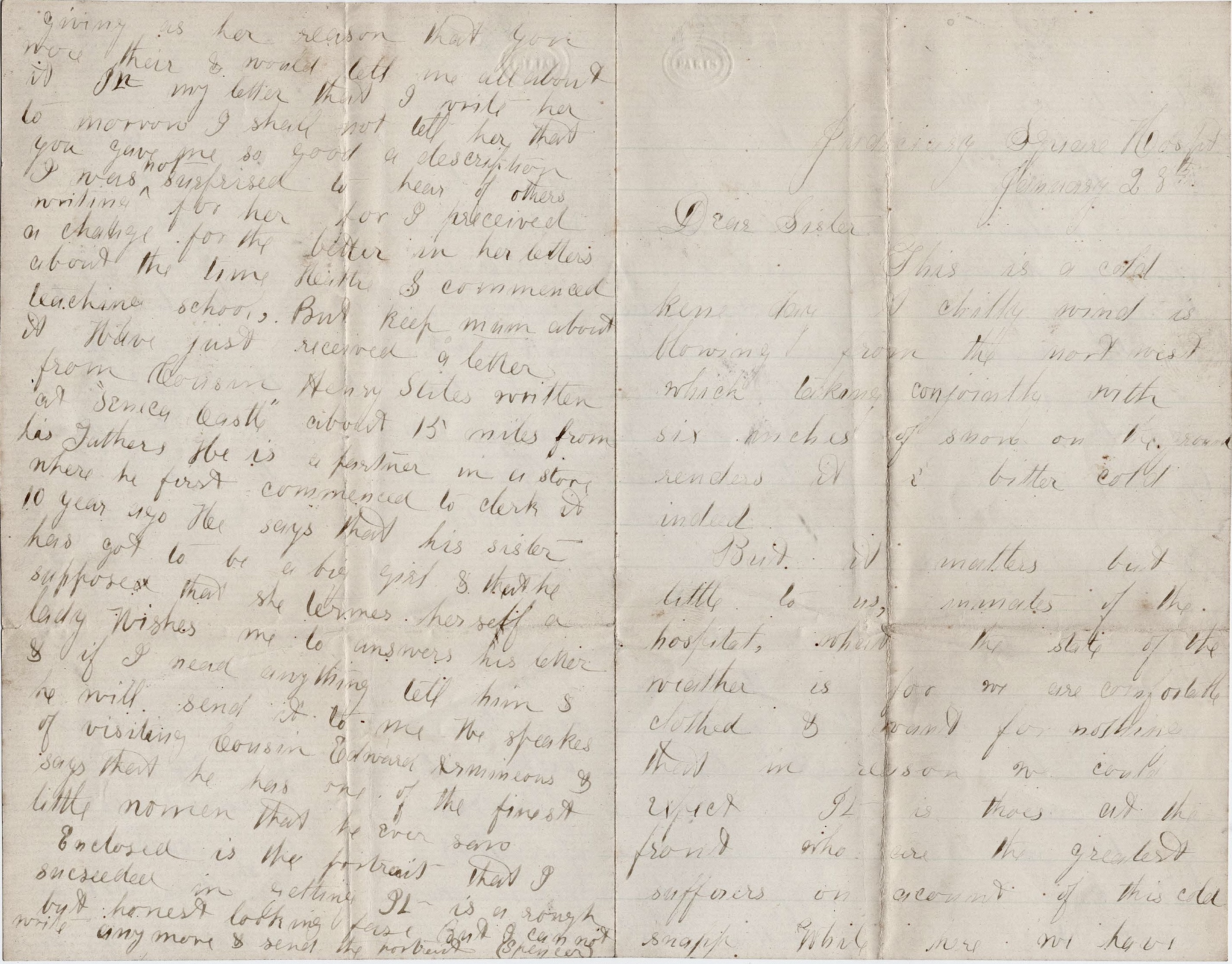 Your letter of the 22nd was received yesterday. The one written the week before, however, has not been received and has no doubt been lost on the road. Your description of the donation was good and was very interesting for everything of any account you speak of. With your letter came one from Mary but she does not say but little in regard to the donation giving as her reason that you were there & would tell me all about it tomorrow. I shall not tell her that you gave me as good a description. I was not surprised to hear of others writing for her for I perceived about the time [ ] I commenced teaching school. But keep mum about it. Have just received a letter from cousin Henry Stiles written at Seneca Castle, about 15 miles from his father’s. He is a partner in a store where he first commenced to clerk it 10 years ago. He says that his sister has got to be a big girl & that he supposed that she terms herself a lady. Wishes me to answer his letter and if I need anything, tell him and he will send it to me. He speaks of visiting cousin Edward & [ ] & says that he has one of the finest little women that he ever saw.