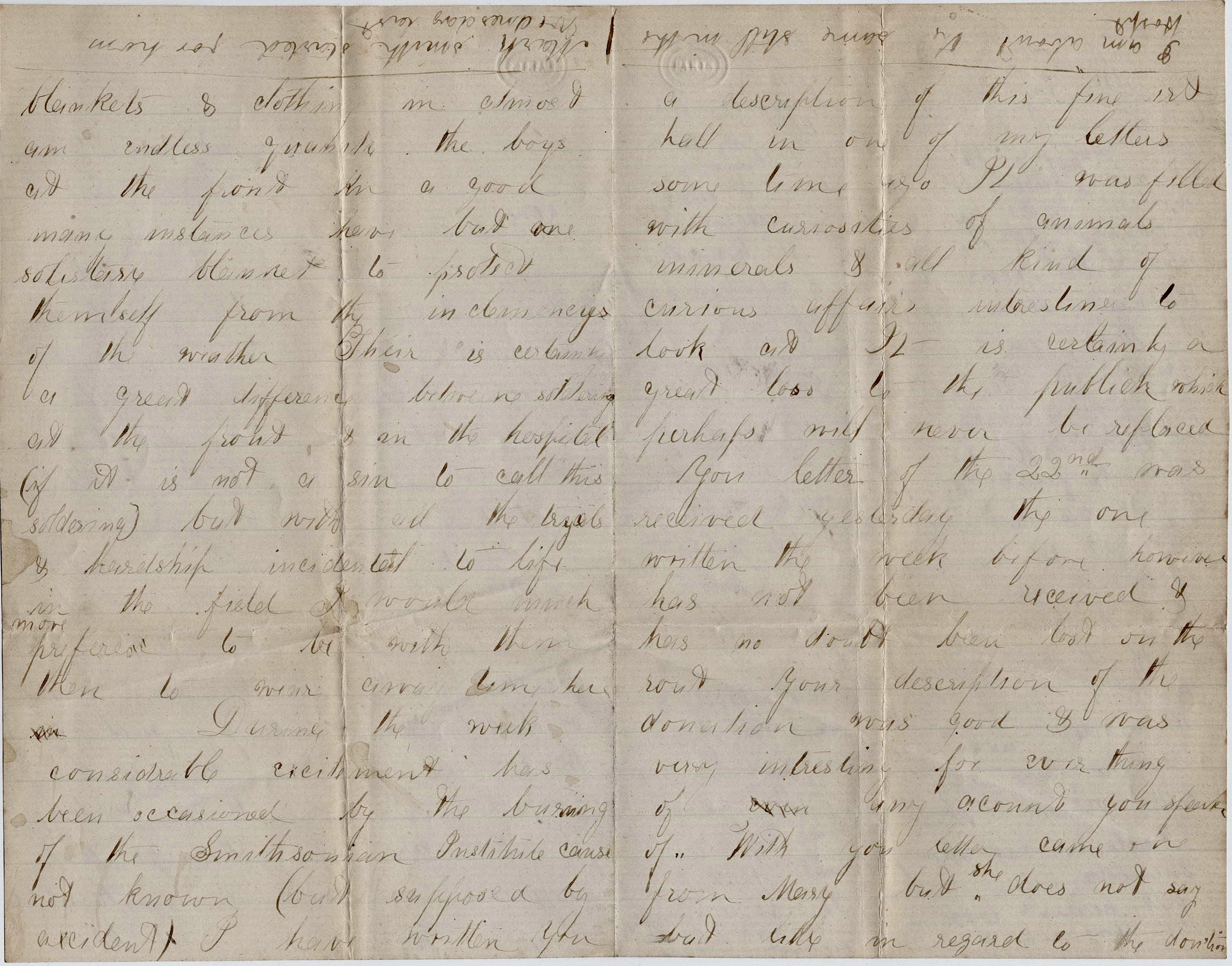 During the week considerable excitement has been occasioned by the burning of the Smithsonian Institute, cause not known (but supposed by accident). I have written you a description of the fine art hall in one of my letters some time ago. It was filled with curiosities of animals, minerals, & all kind of curious affairs interesting to look at. It is certainly a great loss to the public which perhaps will never be replaced.