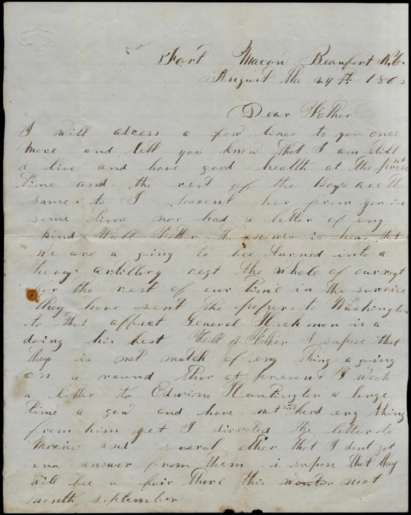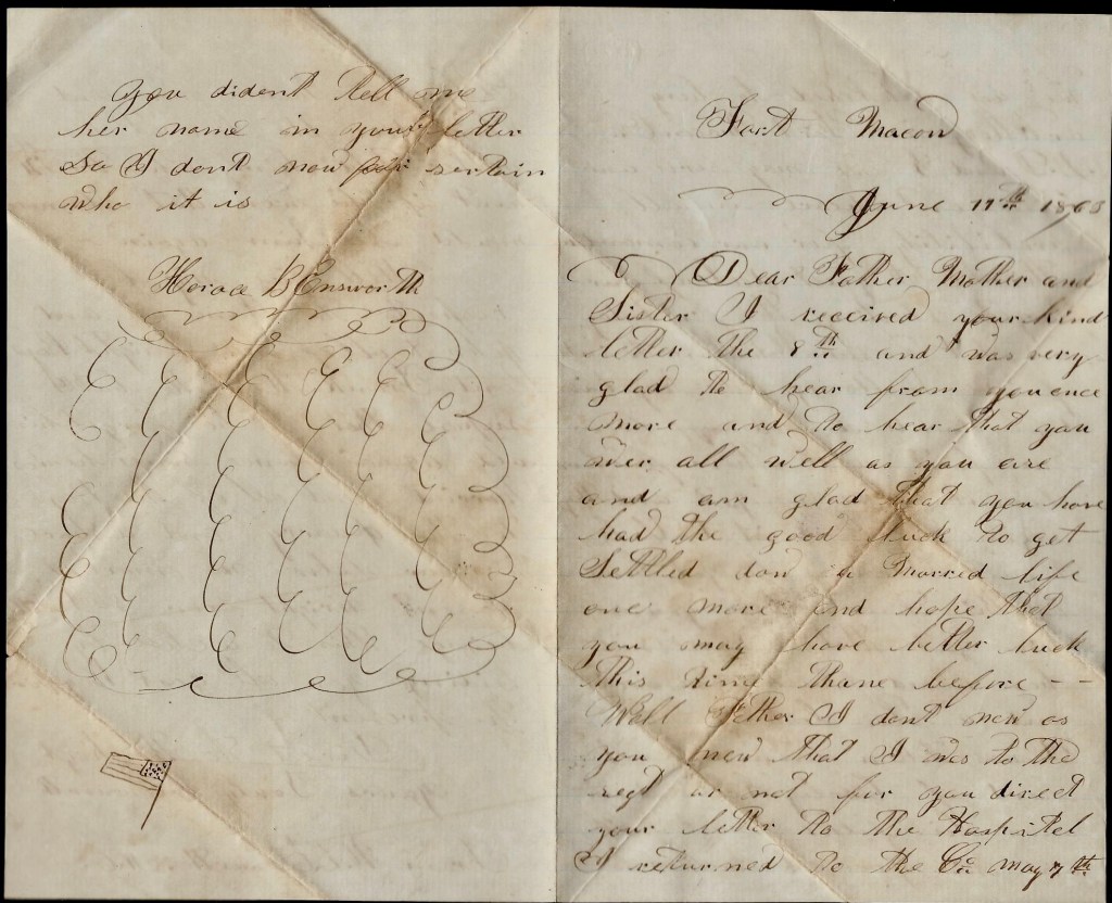 I thought I would write a few lines to let you know that I got your letter while on the Potomac just after leaving Alexandria, or the mail was put on board just as we left. We left Washington and then went to Alexandria by land and stayed to Alexandria one day and then left for Fortress Monroe by the Potomac and steamboat and was on board of her two days. As we was coming down the Potomac, we seen a great many Rebel batteries along the river and when we got to Fortress Monroe, it was a grand sight. The fort covers one hundred acres of ground. It is of solid stone and some thirty feet from the top down to the water. It is straight up and down and all around the fort is a ditch like the canal and the water is very deep so that it is impossible for to get in or out except in one place where there is a drawbridge. We are about 11 miles from the fort right among the Rebels. We are the advance regiment. The Rebels are not two miles from us. Our pickets saw them last night. It is my turn to go on picket tomorrow and then we have our guns loaded all the time, ready for an attack any time. We are close to the James river where the Rebel ship Merrimack is now. Yesterday we heard their guns all day. She had a fight with one of our ships.