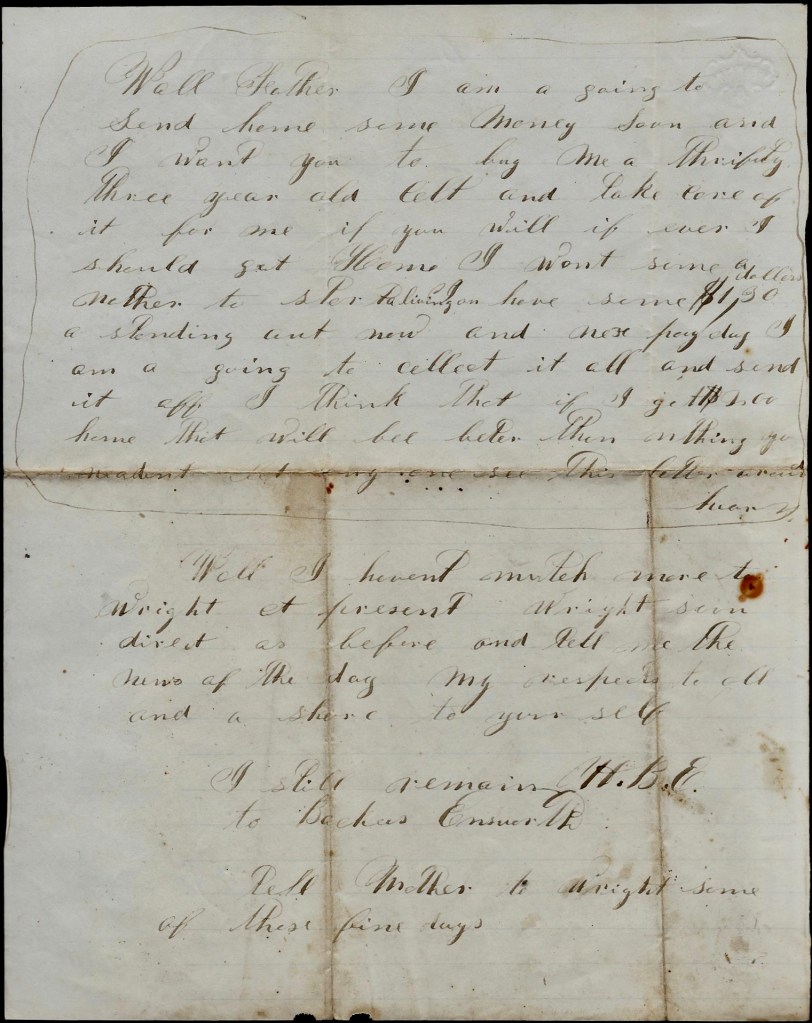 I received your letter last night but was sorry to hear you say that you had not got a letter for I wrote two since I got your letter. I had not had a letter from you in most 5 weeks and so I wrote again. As for that letter, I had not got it but I got the paper but no letter so I was not to blame. Tell Henry I sent him three letters and as you think I have seen enough of the war to be satisfied but I have not for I learn some things every day and you know that if I was there that I would be on the canal and that that would be worse and I can do better here than there.