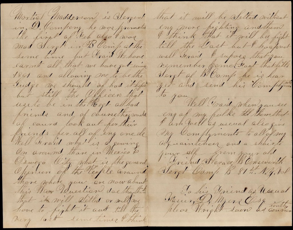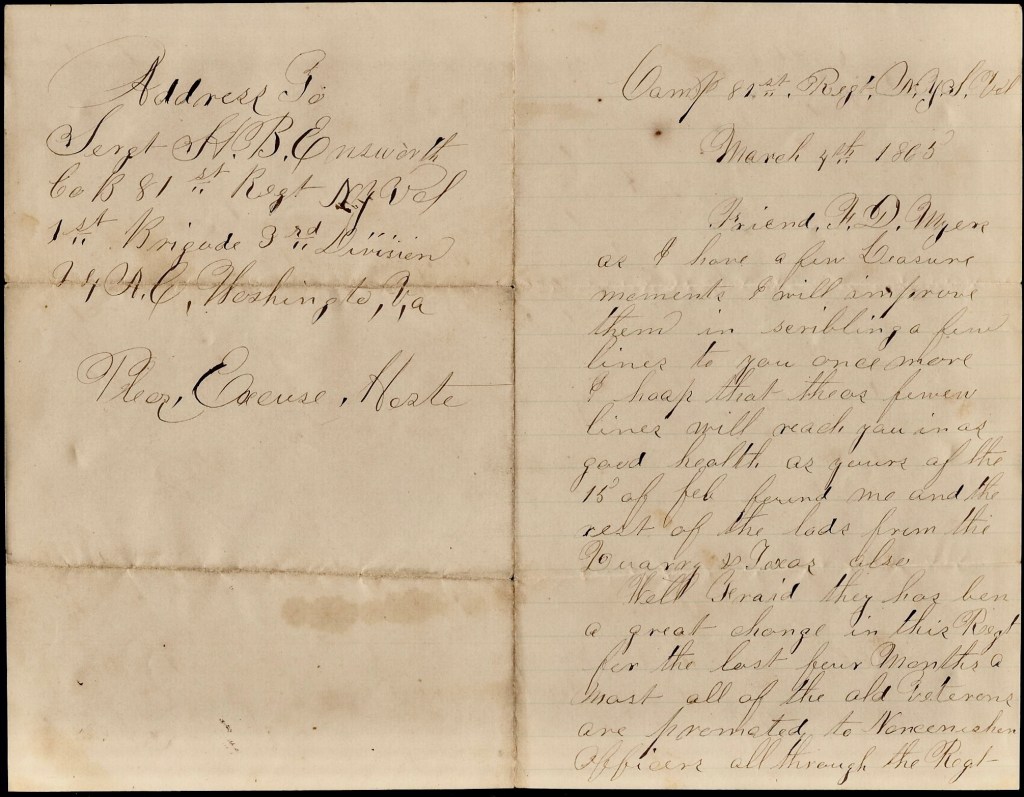 These letters were written by Charles D. Wilson (1846-1916), the son of Robert Wilson and Sarah Ward of Constantia, Oswego county, New York. Charles volunteered to serve in Co. K. , 81st New York Infantry. Charles claimed to have been born in 1843 when he enlisted in December 1861 but census records reveal that he was actually born in 1846 so he was probably only 15 or 16. He reenlisted as a veteran in 1864 and was wounded before Petersburg on 15 August 1864 and mustered out of the service on account of his wounds on 8 September 1865.