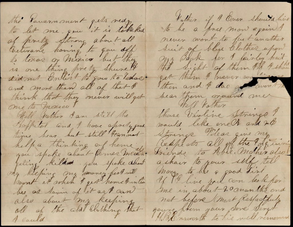As you wanted to know how we fared, I will tell you. We get potatoes and onions, beets and pork bacon, fresh beef, beans, rice, sugar, coffee, tea, and molasses and desecrated vegetable for soup. We live good now—better than we ever did before. We get hard bread—that is the worst of it. And as for clothing, we can get that whenever we want it. Every week if one liked to get it. So often they will not let a man go dirty and ragged. We are inspected every week by the general and we have got to be clean when we come out, as well as our guns.
