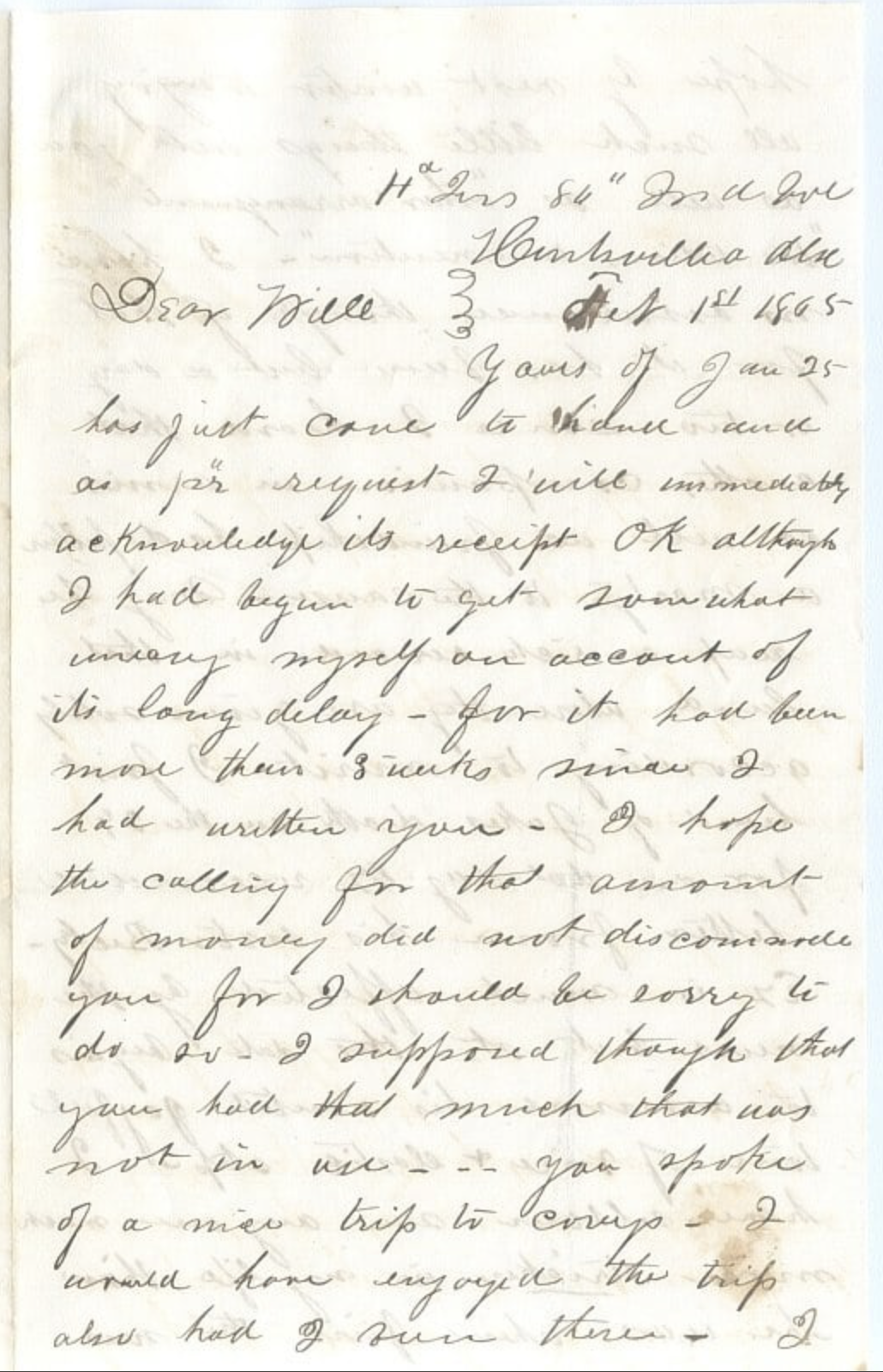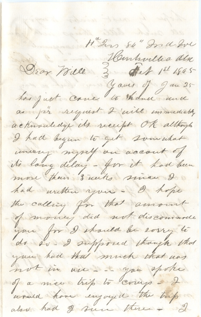 Yours of January 25th has just come to hand and as per request, I will immediately acknowledge its receipt OK although I had begun to get somewhat uneasy myself on account of its long delay, for it had been more than three weeks since I had written you. I hope the calling for that money did not discommode you for I should be sorry to do so. I supposed though that you had that much that was not in use.