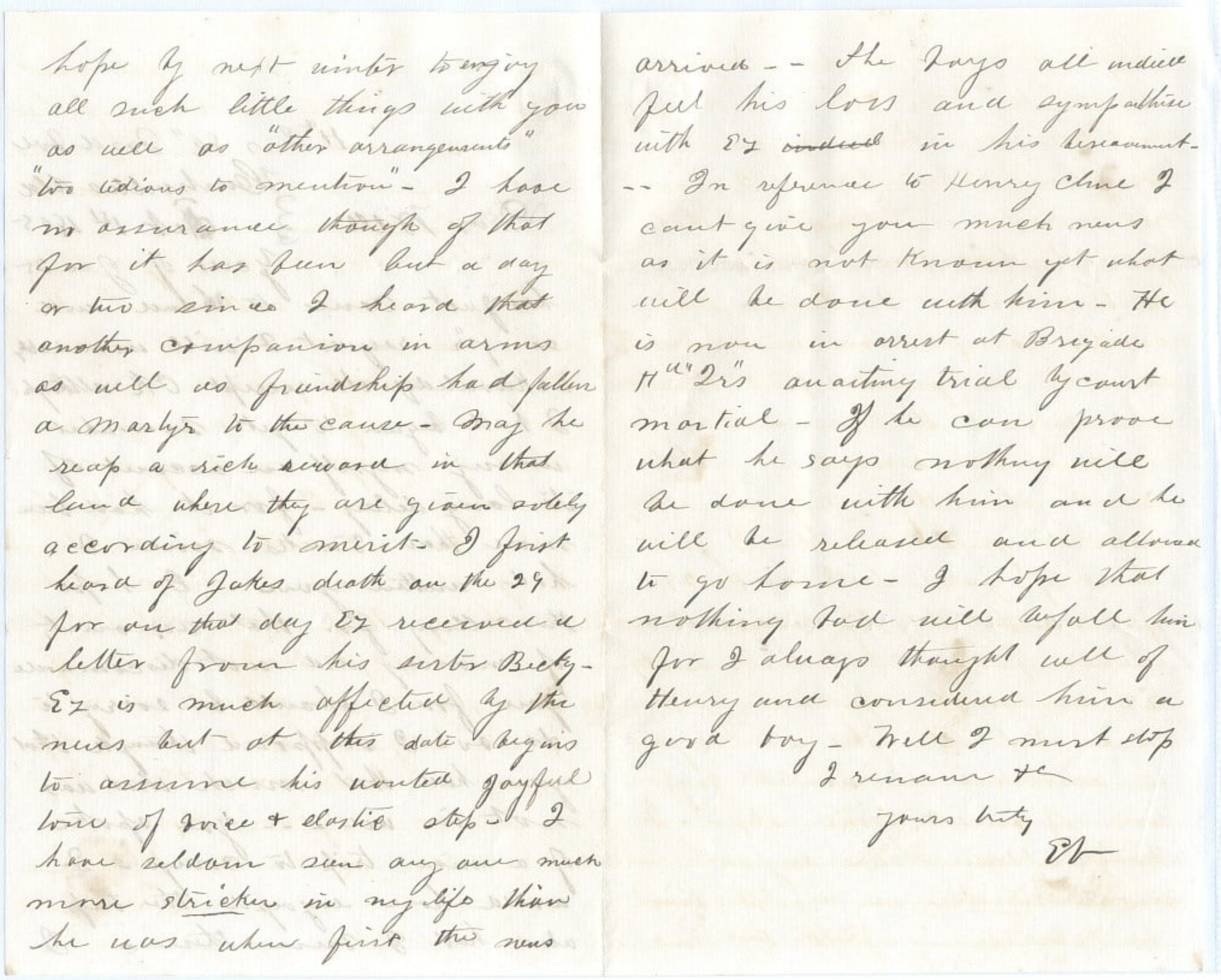 You spoke of a nice trip to Corup [?]. I would have enjoyed the trip also had a been there. I hope by next winter to enjoy all such little things with you as well as “other arrangements too tedious to mention.” I have no assurance though of that for it has been but a day or two since I heard that another companion in arms as well as friendship had fallen a martyr to the cause. May he reap a rich reward in that land where they are given solely according to merit. I first heard of Jake’s death on the 29th for on that day Ez received a letter from his sister Becky. Ez is much affected by the news but at this date begins to assume his wonted joyful tone of voice & elastic step. I have seldom seen anyone much more stricken in my life than he was when first the news arrived. The boys all indeed feel his loss and sympathize with Ez in his bereavement. 1