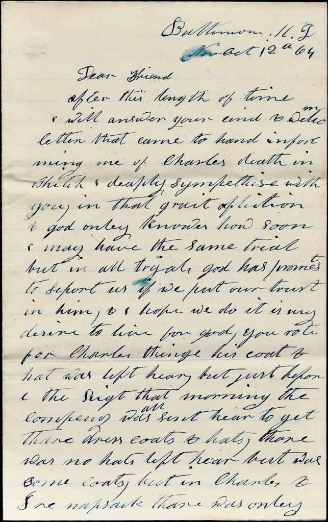 After this length of time, I will answer yours and Deliom’s letter that came to hand informing me of Charles’ death in which I deeply sympathize with you in that great affliction. God only knows how soon I may have the same trials. God has promised to support us if we put our trust in Him & I hope we do. It is my desire to live for God.