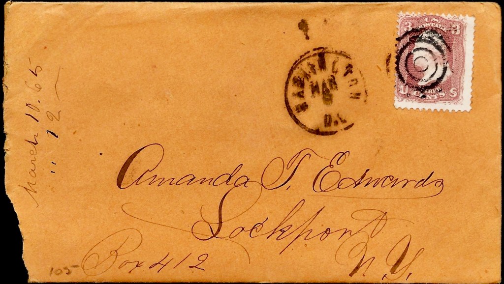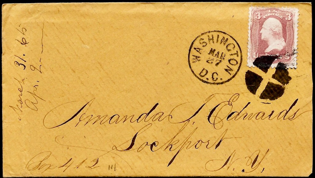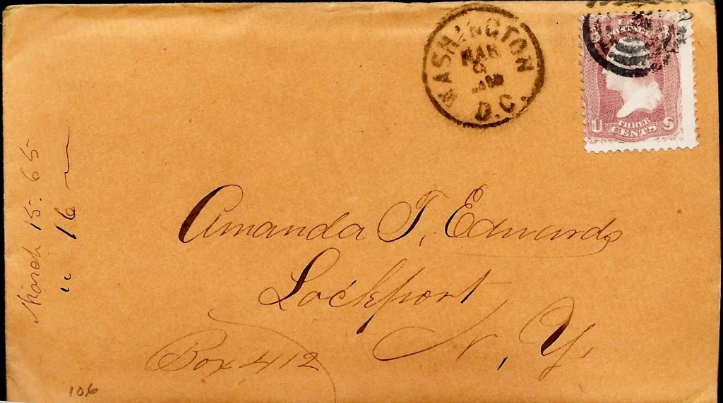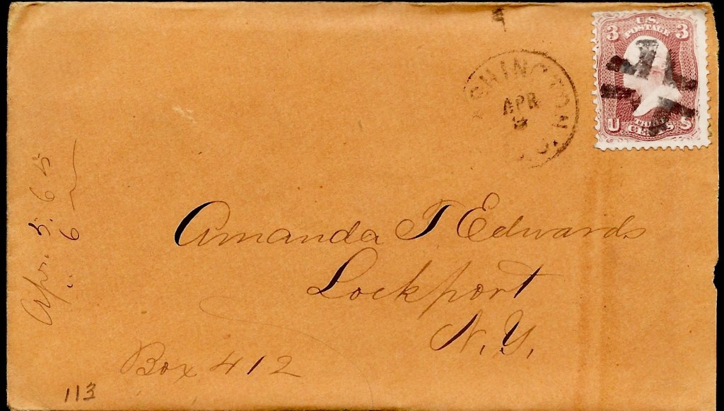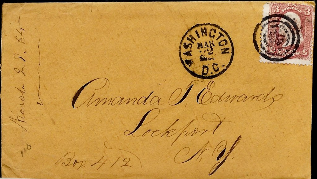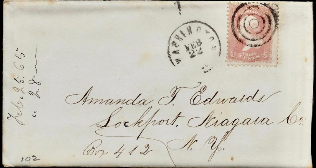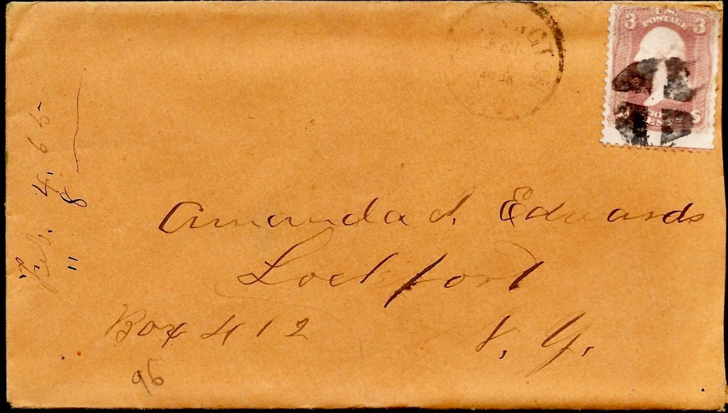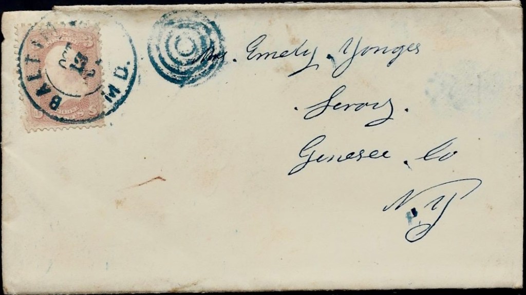 The letter was directed to Emily (Seevey) Youngs (1823-1883), the wife of Isaac Youngs (1817-1904), of Le Roy, Genesee county, New York. Emily’s oldest child, Charles J. Youngs (1844-1864) enlisted on 4 January 1864 as a private in Co. L, 8th New York Heavy Artillery, but became ill in before Petersburg and was sent to a Washington hospital where he died on 3 August 1864.