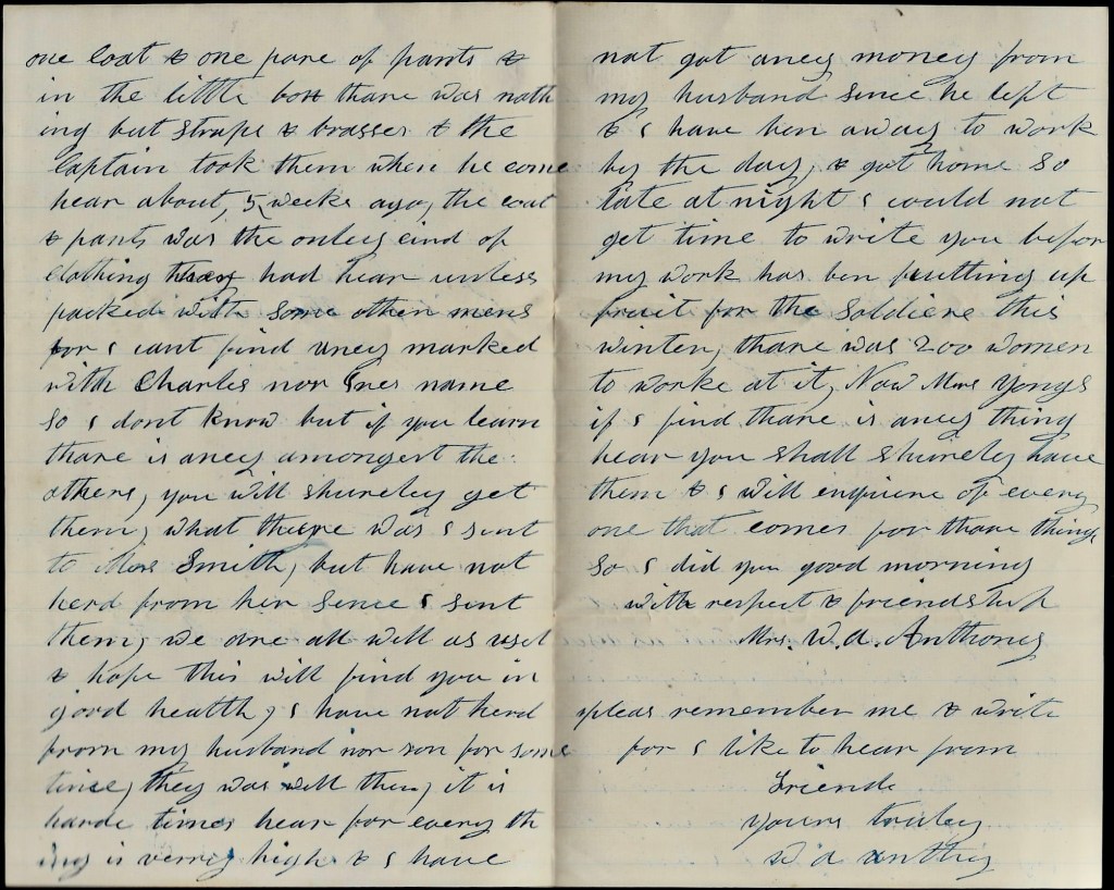We are all well as usual & hope this will find you in good health. I have not heard from my husband nor son for some time. They was well then. It is hard times here for everything is very high & I have not got any money from my husband since he left. I have been away to work by the day & got home so late at night I could not get time to write you before. My work has been putting up fruit for the soldiers this winter. There was 200 women to work at it. Now, Mrs. Youngs, if I find there is anything here, you shall surely have them & I will enquire of everyone that comes for their things. So I bid you good morning with respect & friendship, — Mrs. W. A. Anthony
