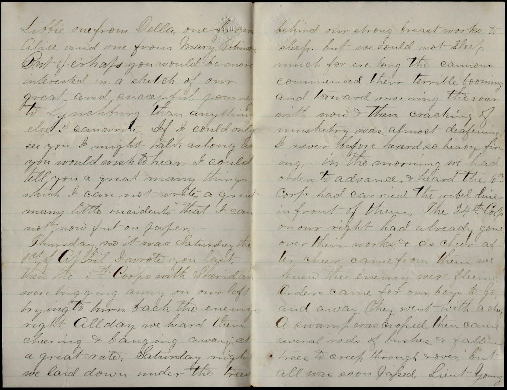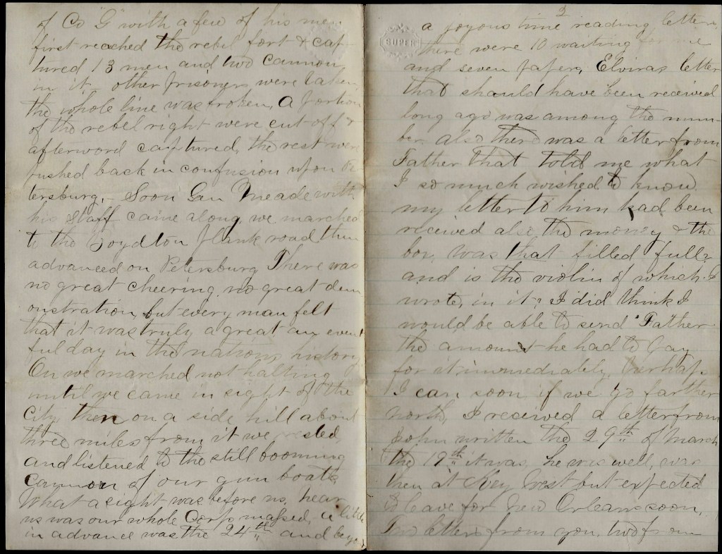 I was out on the picket line yesterday morning about a half mile to the right of us, on the bank of the Appomattox and had a good view of the City we have so lone been striving to gain possession of. There is was not more than a half mile distant, in plain view, and still we dare not, could not, take possession of it. But we hope it will not be long ere our own stars & stripes will wave over it.